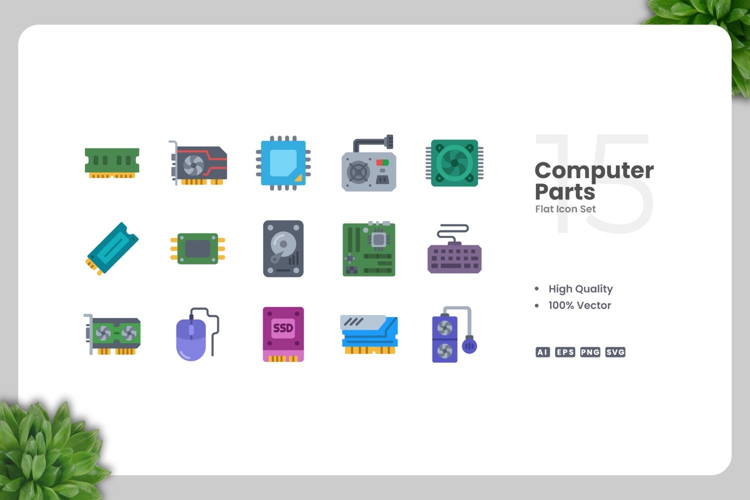 Set of 15 Computer Parts flat icons | Simple and clean design, perfect for websites, mobile apps, books, social media, infographics, flyer, print, banners, posters and many more. To resize or change color you can easily edit on vector software like Adobe Illustrator and CorelDRAW.