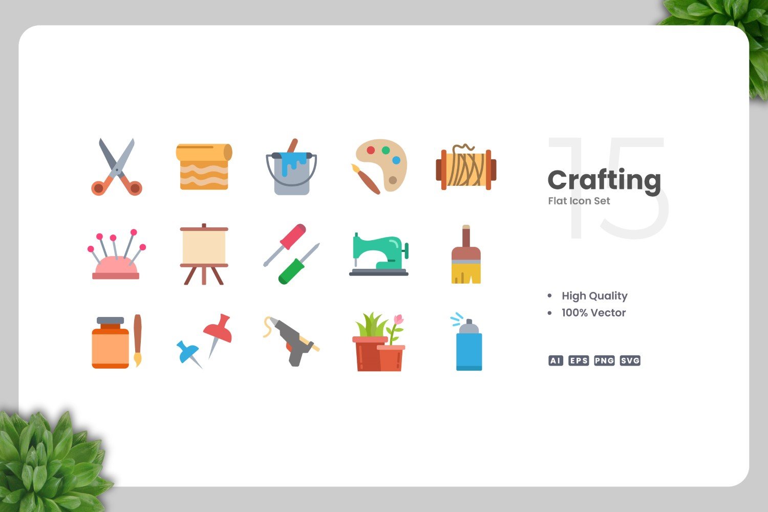 Set of 15 Crafting flat icons | Simple and clean design, perfect for websites, mobile apps, books, social media, infographics, flyer, print, banners, posters and many more. To resize or change color you can easily edit on vector software like Adobe Illustrator and CorelDRAW.