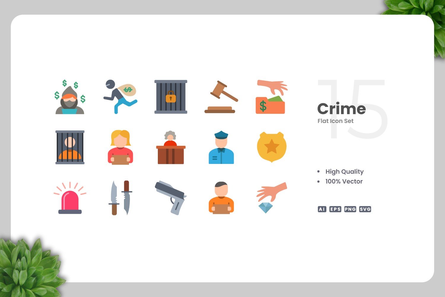 Set of 15 Crime flat icons | Simple and clean design, perfect for websites, mobile apps, books, social media, infographics, flyer, print, banners, posters and many more. To resize or change color you can easily edit on vector software like Adobe Illustrator and CorelDRAW.