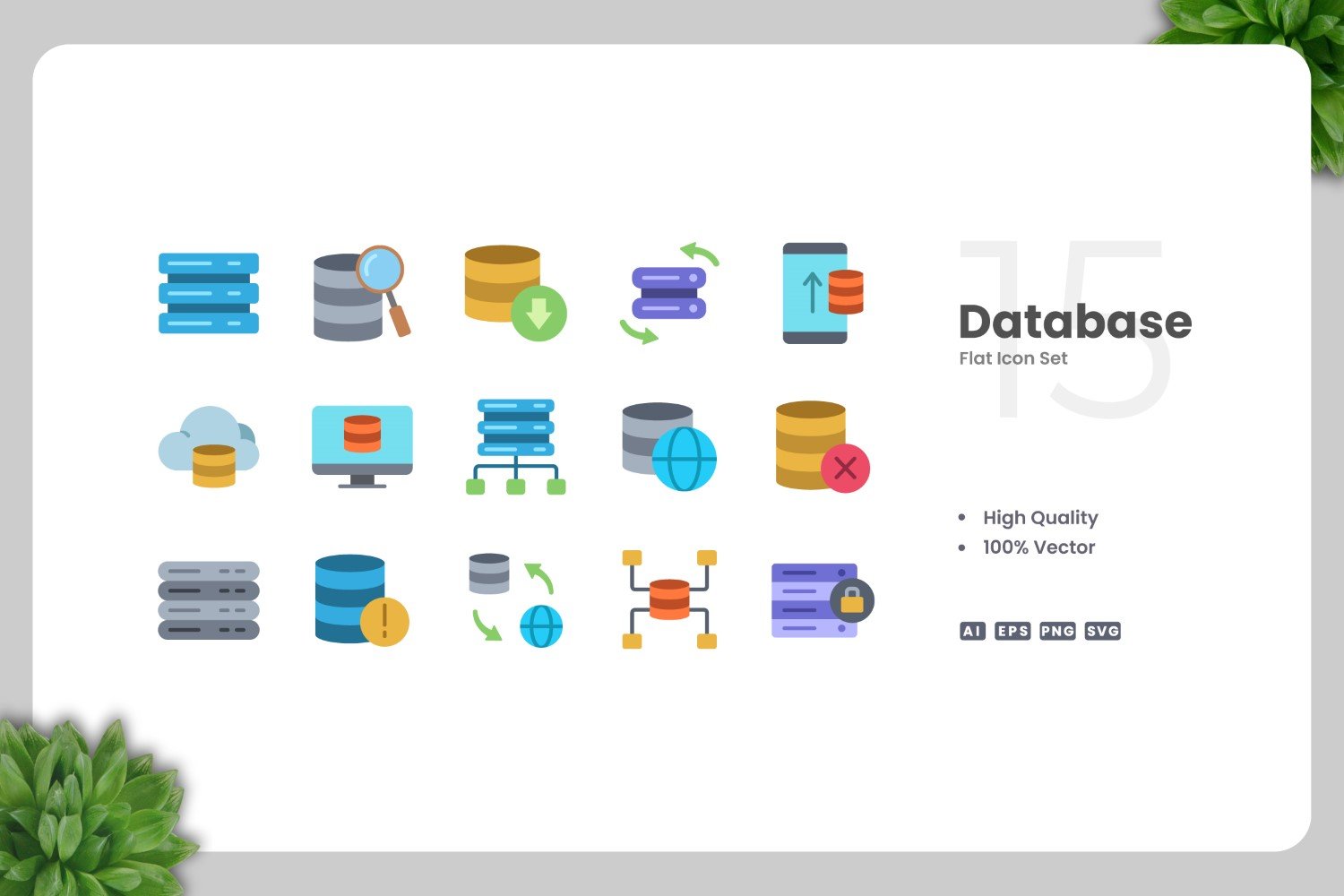 Set of 15 Database flat icons | Simple and clean design, perfect for websites, mobile apps, books, social media, infographics, flyer, print, banners, posters and many more. To resize or change color you can easily edit on vector software like Adobe Illustrator and CorelDRAW.