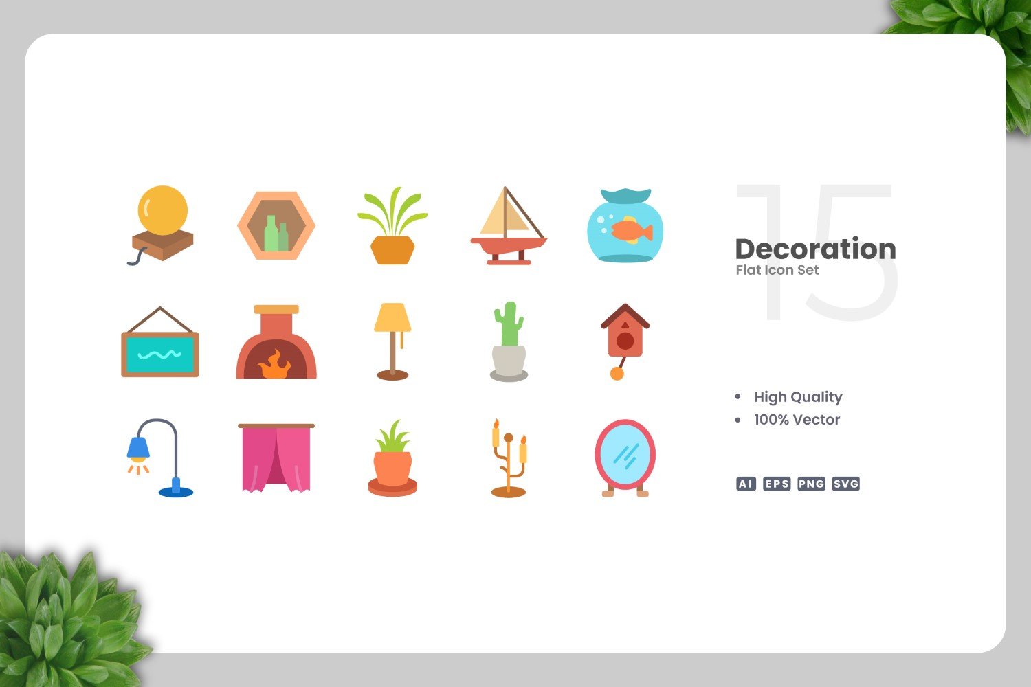 Set of 15 Decoration flat icons | Simple and clean design, perfect for websites, mobile apps, books, social media, infographics, flyer, print, banners, posters and many more. To resize or change color you can easily edit on vector software like Adobe Illustrator and CorelDRAW.