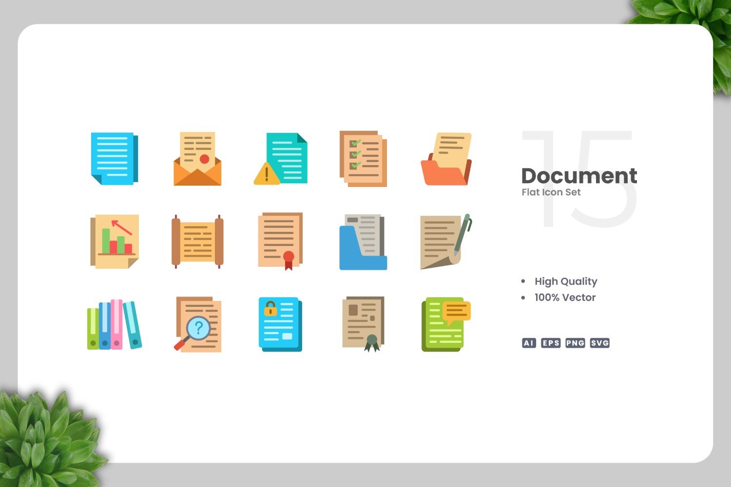 Set of 15 Document flat icons | Simple and clean design, perfect for websites, mobile apps, books, social media, infographics, flyer, print, banners, posters and many more. To resize or change color you can easily edit on vector software like Adobe Illustrator and CorelDRAW.