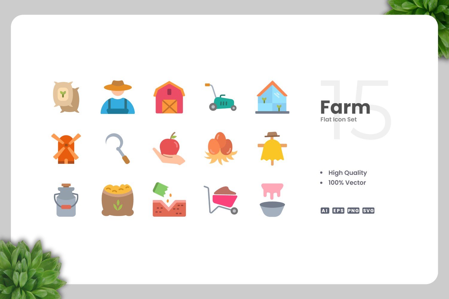 Set of 15 Farm flat icons | Simple and clean design, perfect for websites, mobile apps, books, social media, infographics, flyer, print, banners, posters and many more. To resize or change color you can easily edit on vector software like Adobe Illustrator and CorelDRAW.