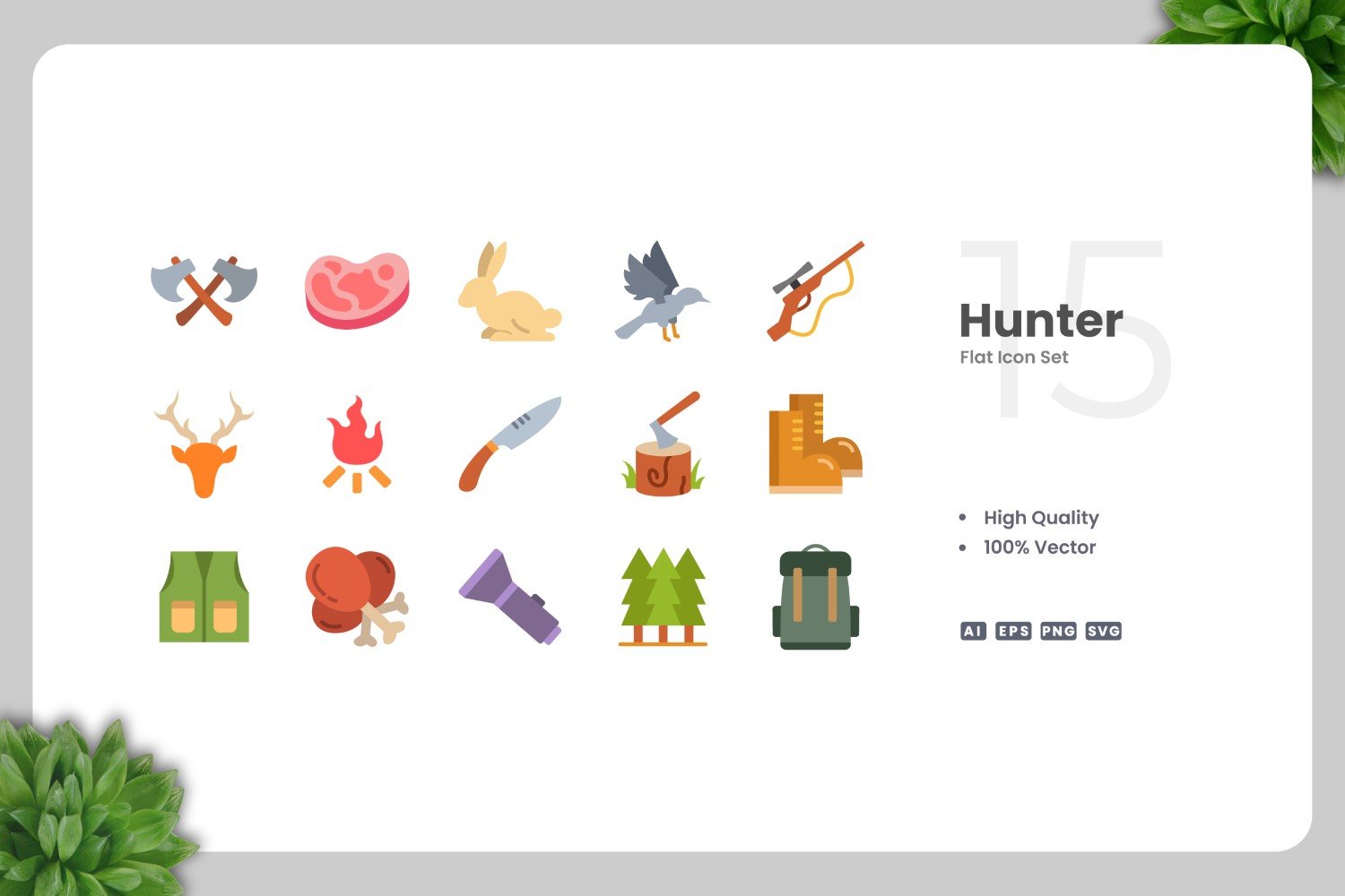 Set of 15 Hunter flat icons | Simple and clean design, perfect for websites, mobile apps, books, social media, infographics, flyer, print, banners, posters and many more. To resize or change color you can easily edit on vector software like Adobe Illustrator and CorelDRAW.