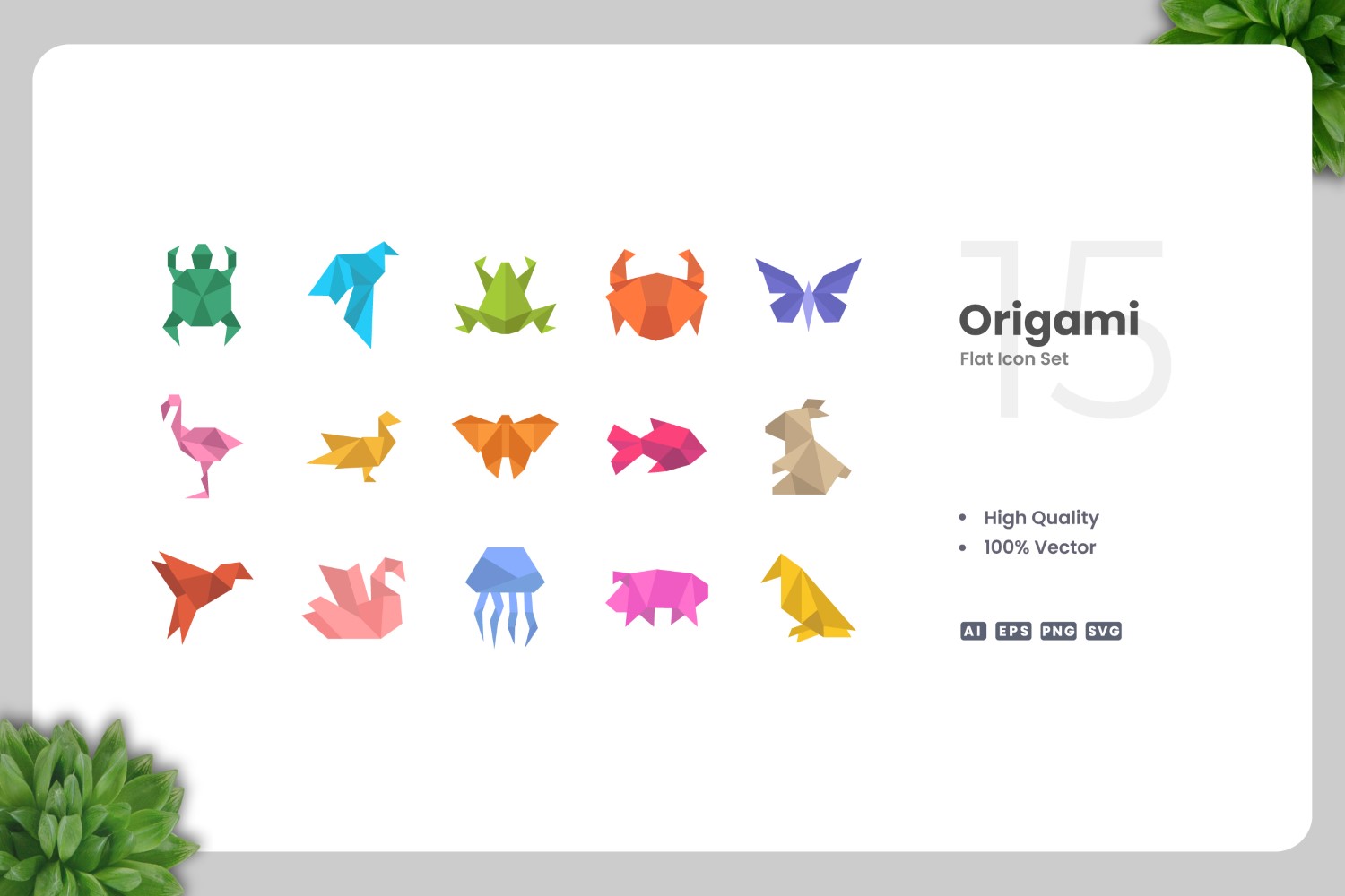 Set of 15 Origami flat icons | Simple and clean design, perfect for websites, mobile apps, books, social media, infographics, flyer, print, banners, posters and many more. To resize or change color you can easily edit on vector software like Adobe Illustrator and CorelDRAW.