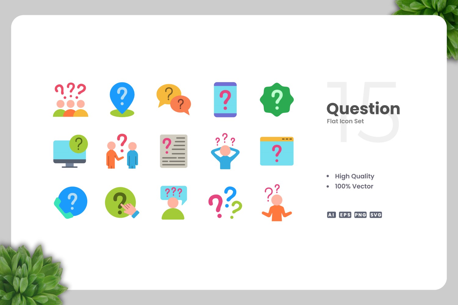 Set of 15 Question flat icons | Simple and clean design, perfect for websites, mobile apps, books, social media, infographics, flyer, print, banners, posters and many more. To resize or change color you can easily edit on vector software like Adobe Illustrator and CorelDRAW.