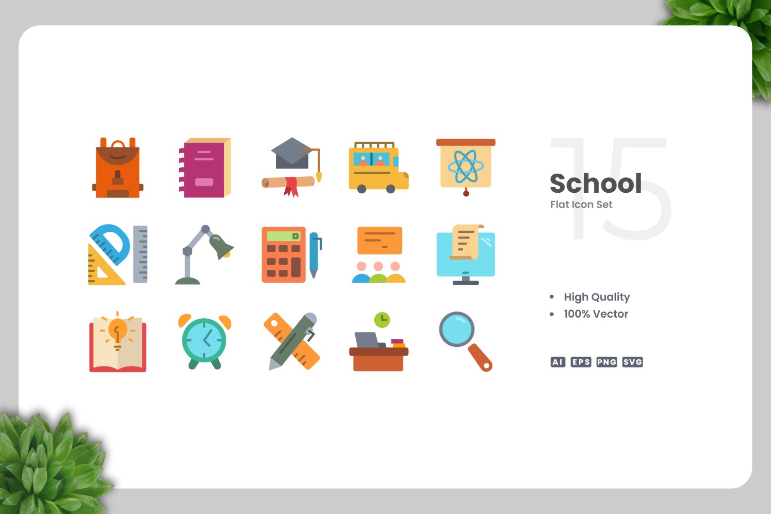 Set of 15 School flat icons | Simple and clean design, perfect for websites, mobile apps, books, social media, infographics, flyer, print, banners, posters and many more. To resize or change color you can easily edit on vector software like Adobe Illustrator and CorelDRAW.