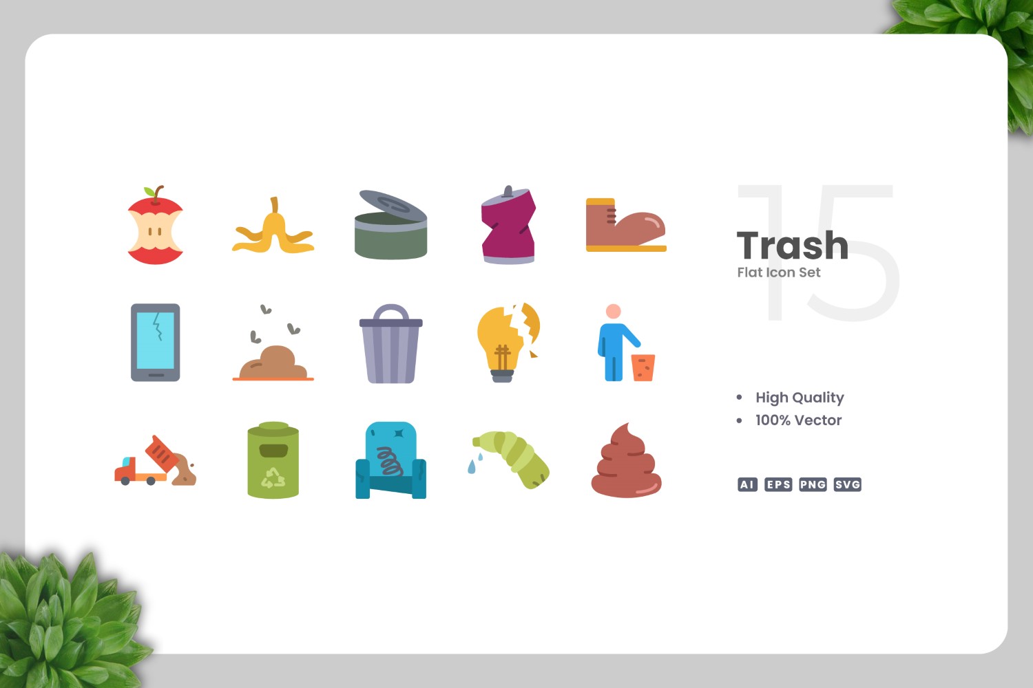 Set of 15 Trash flat icons | Simple and clean design, perfect for websites, mobile apps, books, social media, infographics, flyer, print, banners, posters and many more. To resize or change color you can easily edit on vector software like Adobe Illustrator and CorelDRAW.
