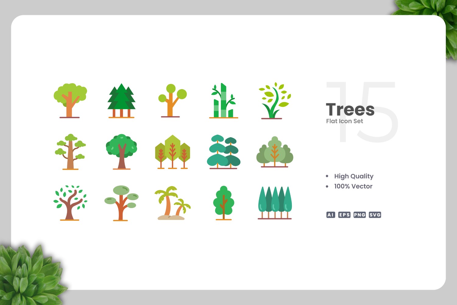 Set of 15 Trees flat icons | Simple and clean design, perfect for websites, mobile apps, books, social media, infographics, flyer, print, banners, posters and many more. To resize or change color you can easily edit on vector software like Adobe Illustrator and CorelDRAW.