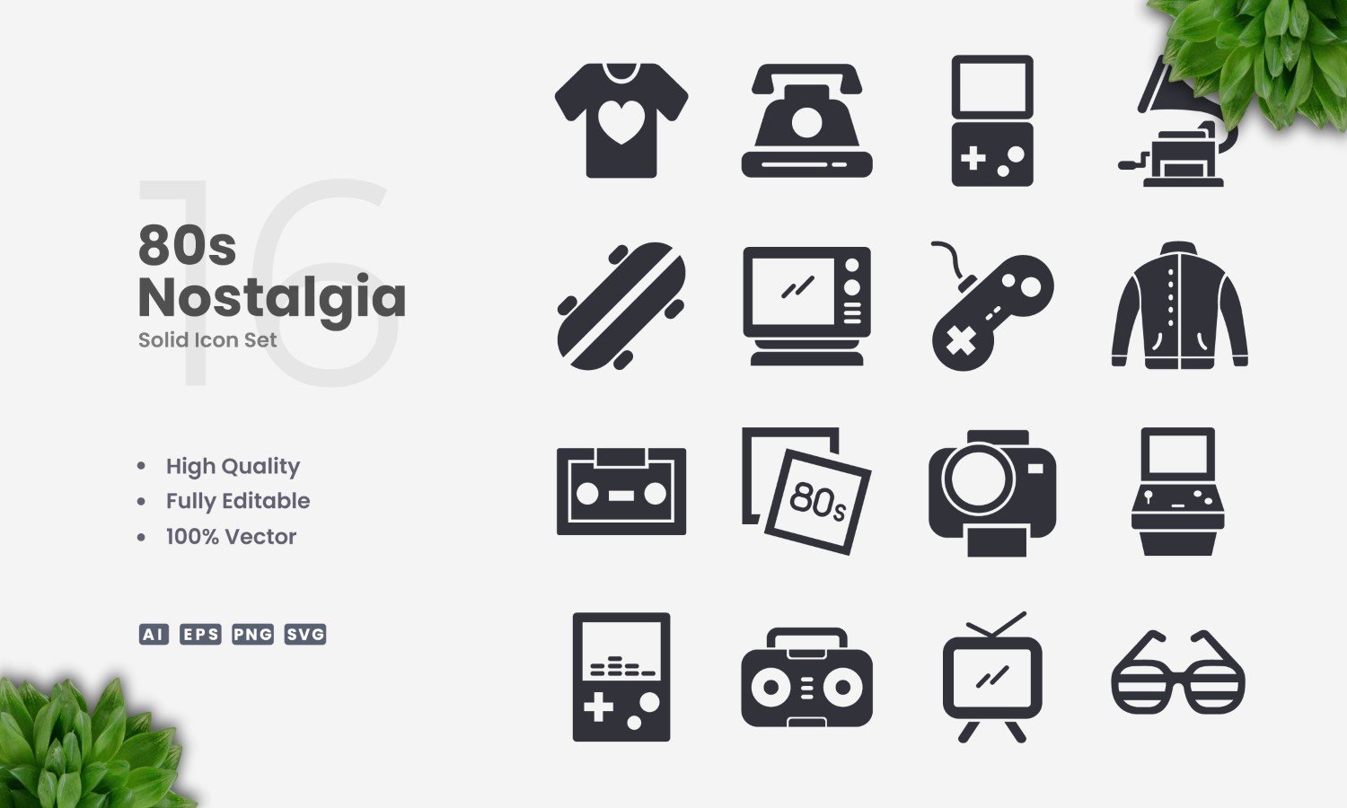 Set of 16 80s Nostalgia solid icons | Simple and clean design, perfect for websites, mobile apps, books, social media, infographics, flyer, print, banners, posters and many more. To resize or change color you can easily edit on vector software like Adobe Illustrator and CorelDRAW.