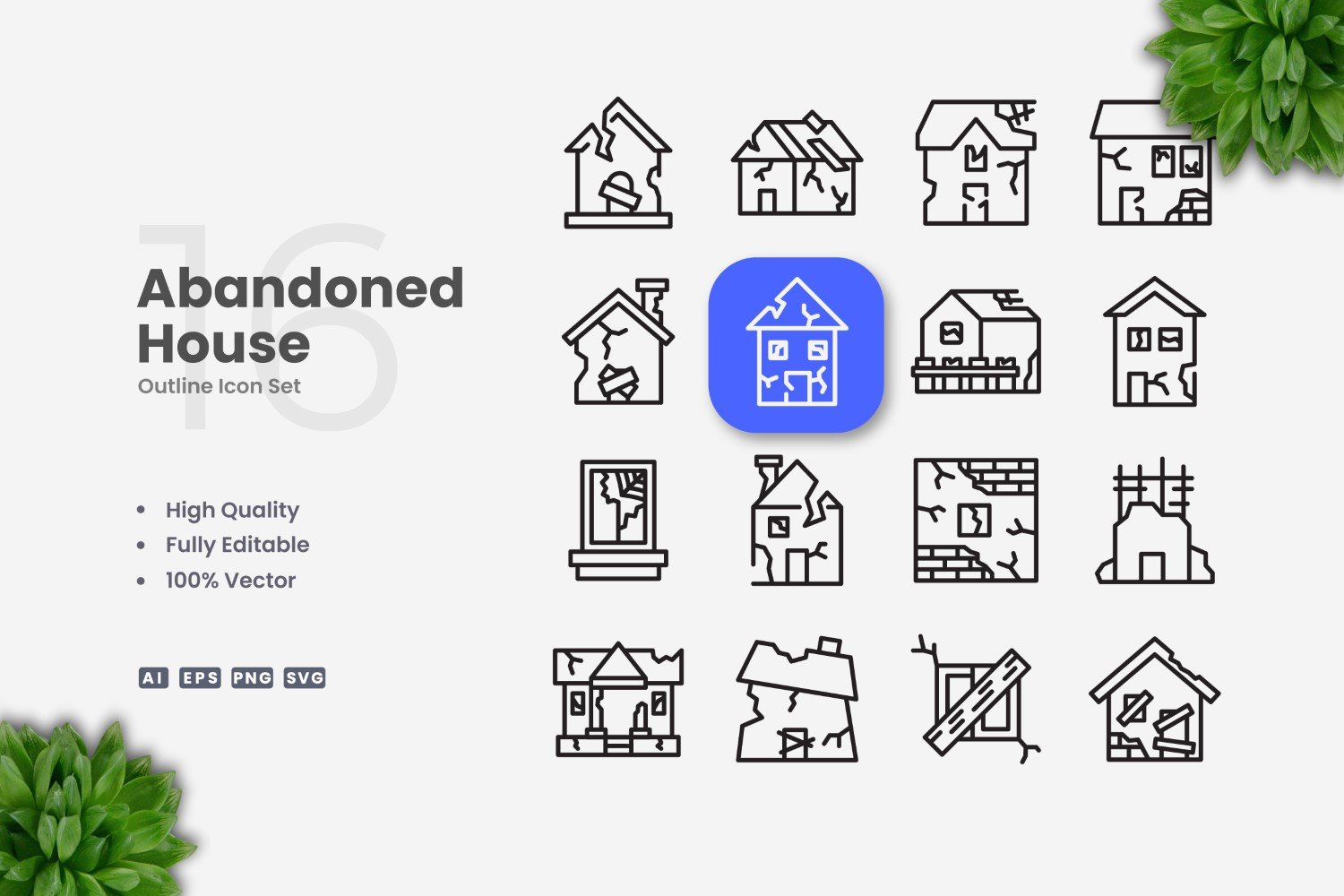 Set of 16 Abandoned House outline icons | Simple and clean design,perfect for websites, mobile apps, books, social media, infographics, flyer, print, banners, posters and many more. To resize, change color, or edit stroke weight ,you can easily edit on vector software like Adobe Illustrator and CorelDRAW.
