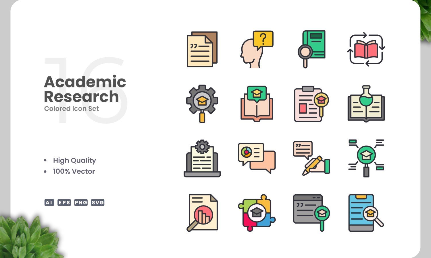 Set of 16 Academic Research color icons | Simple and clean design, perfect for websites, mobile apps, books, social media, infographics, flyer, print, banners, posters and many more. To resize or change color you can easily edit on vector software like Adobe Illustrator and CorelDRAW.