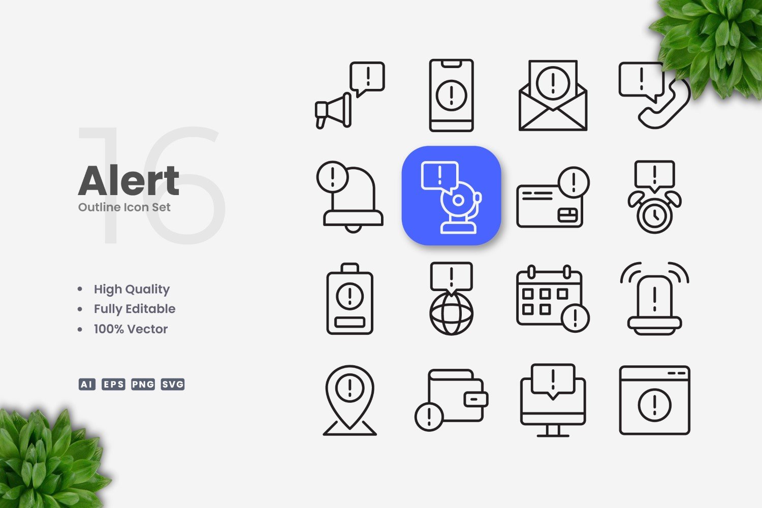 Set of 16 Alert outline icons | Simple and clean design,perfect for websites, mobile apps, books, social media, infographics, flyer, print, banners, posters and many more. To resize, change color, or edit stroke weight ,you can easily edit on vector software like Adobe Illustrator and CorelDRAW.