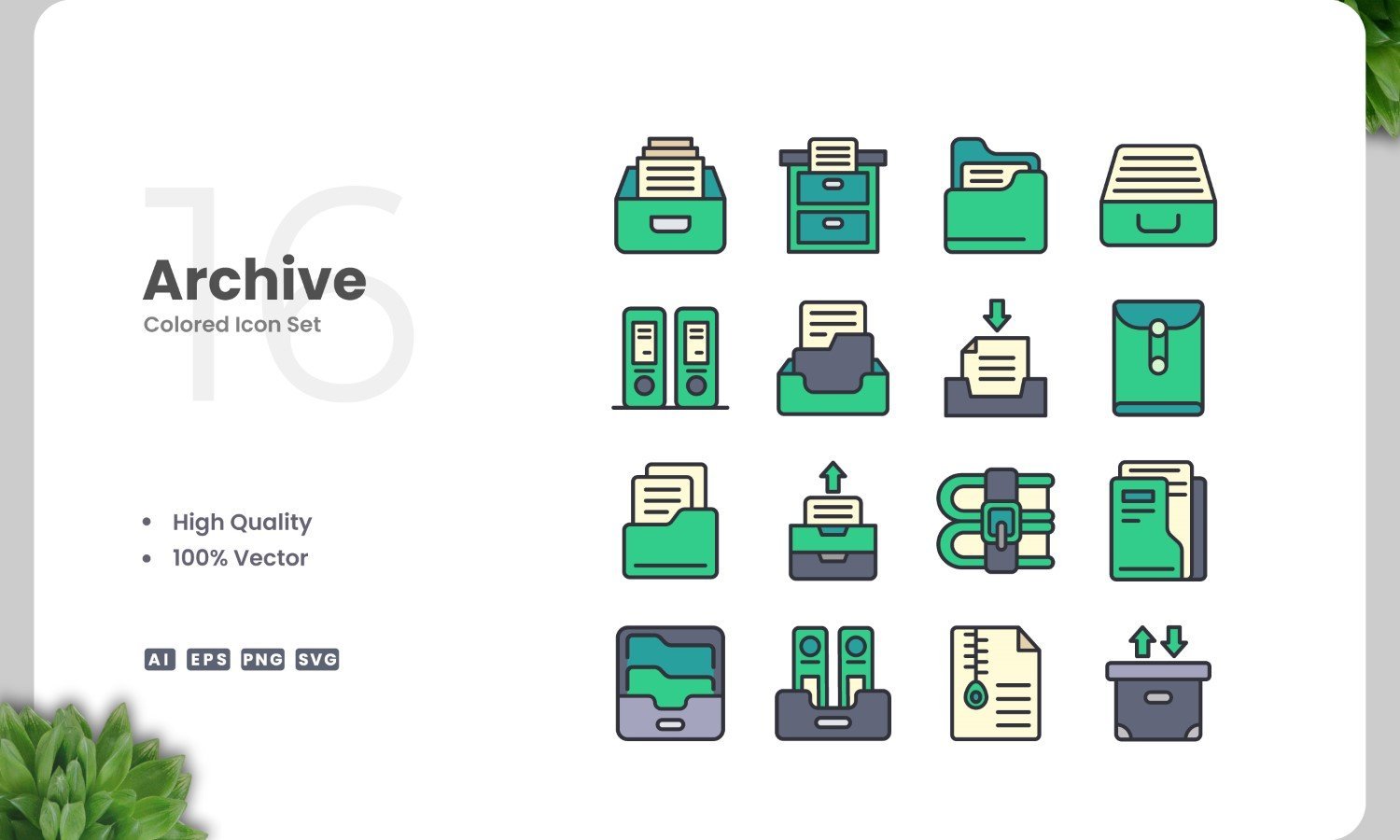 Set of 16 Archive color icons | Simple and clean design, perfect for websites, mobile apps, books, social media, infographics, flyer, print, banners, posters and many more. To resize or change color you can easily edit on vector software like Adobe Illustrator and CorelDRAW.