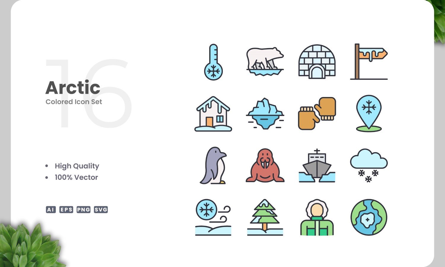 Set of 16 Arctic color icons | Simple and clean design, perfect for websites, mobile apps, books, social media, infographics, flyer, print, banners, posters and many more. To resize or change color you can easily edit on vector software like Adobe Illustrator and CorelDRAW.