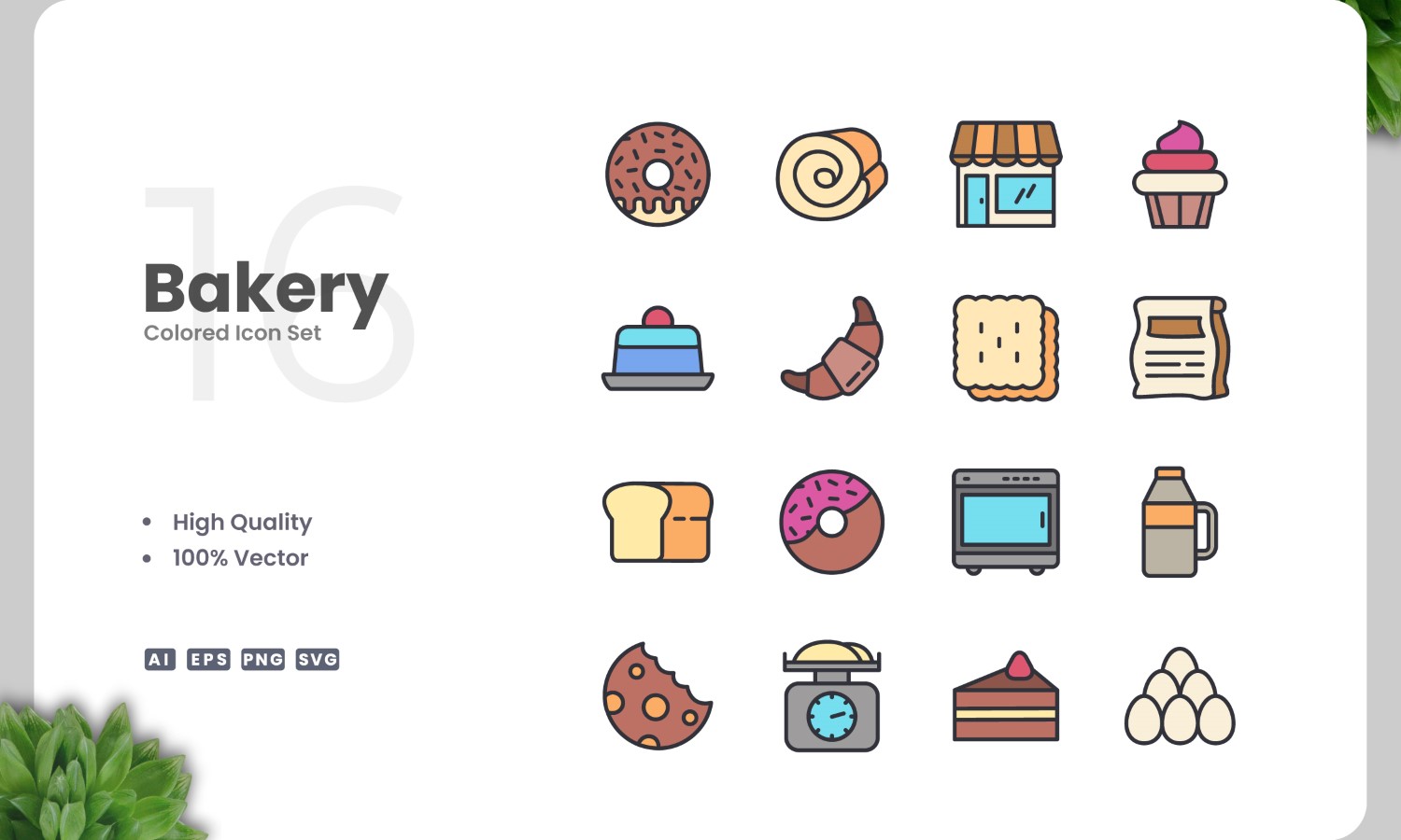 Set of 16 Bakery color icons | Simple and clean design, perfect for websites, mobile apps, books, social media, infographics, flyer, print, banners, posters and many more. To resize or change color you can easily edit on vector software like Adobe Illustrator and CorelDRAW.