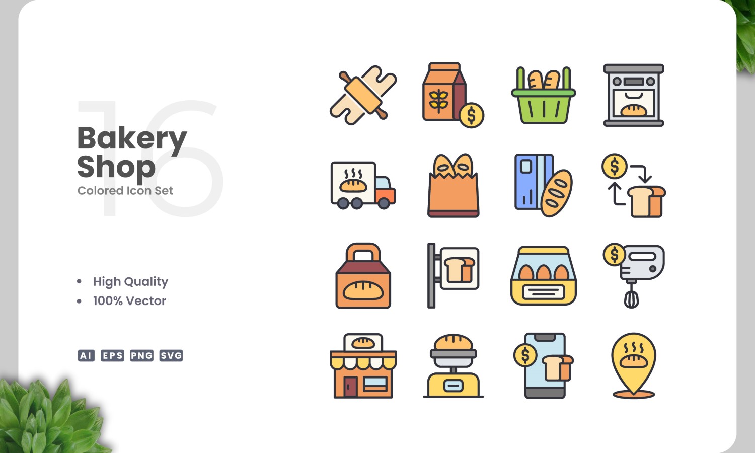 Set of 16 Bakery Shop color icons | Simple and clean design, perfect for websites, mobile apps, books, social media, infographics, flyer, print, banners, posters and many more. To resize or change color you can easily edit on vector software like Adobe Illustrator and CorelDRAW.