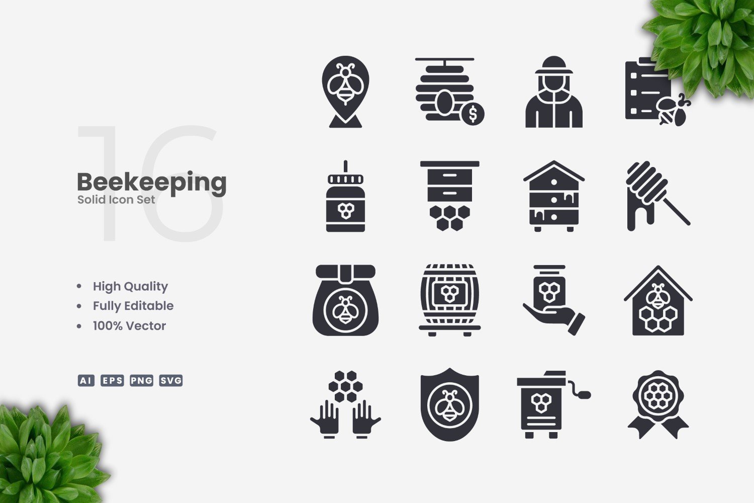 Set of 16 Beekeping Solid Icons | Simple and clean design, perfect for websites, mobile apps, books, social media, infographics, flyer, print, banners, posters and many more. To resize or change color you can easily edit on vector software like Adobe Illustrator and CorelDRAW.