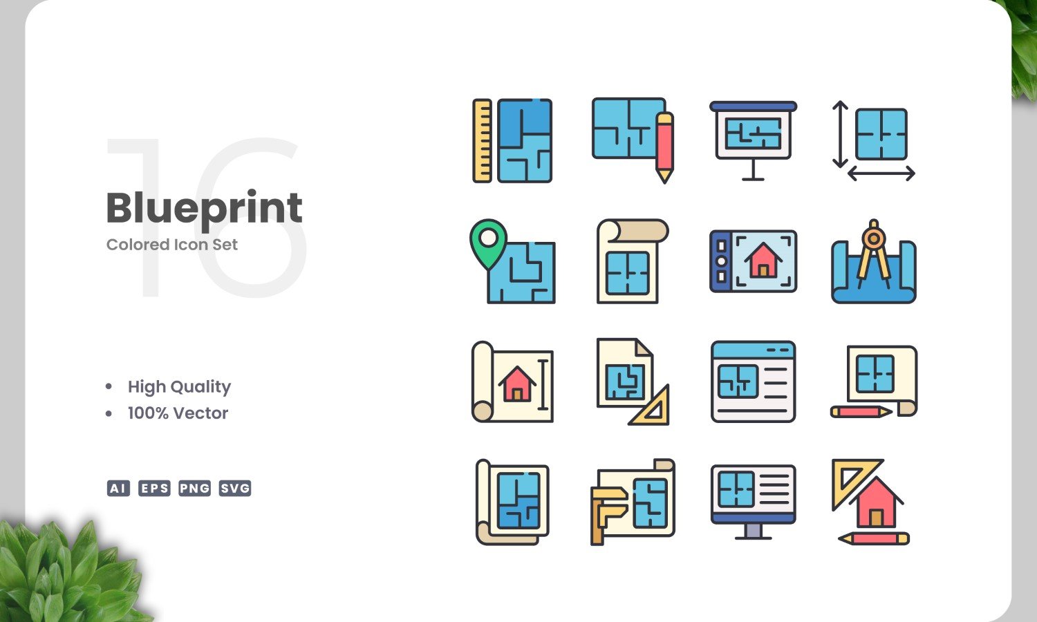 Set of 16 Blueprint color icons | Simple and clean design, perfect for websites, mobile apps, books, social media, infographics, flyer, print, banners, posters and many more. To resize or change color you can easily edit on vector software like Adobe Illustrator and CorelDRAW.