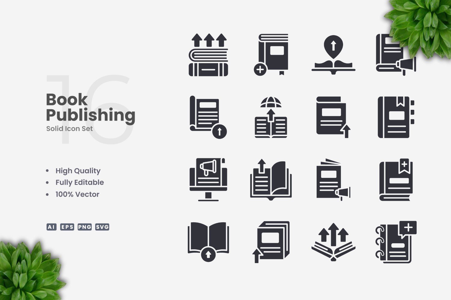 Set of 16 Book Publishing Solid Icons | Simple and clean design, perfect for websites, mobile apps, books, social media, infographics, flyer, print, banners, posters and many more. To resize or change color you can easily edit on vector software like Adobe Illustrator and CorelDRAW.
