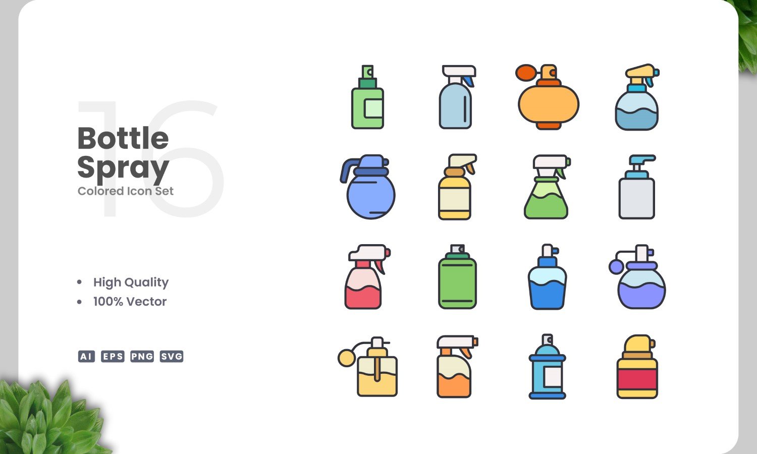 Set of 16 Bottle Spray color icons | Simple and clean design, perfect for websites, mobile apps, books, social media, infographics, flyer, print, banners, posters and many more. To resize or change color you can easily edit on vector software like Adobe Illustrator and CorelDRAW.