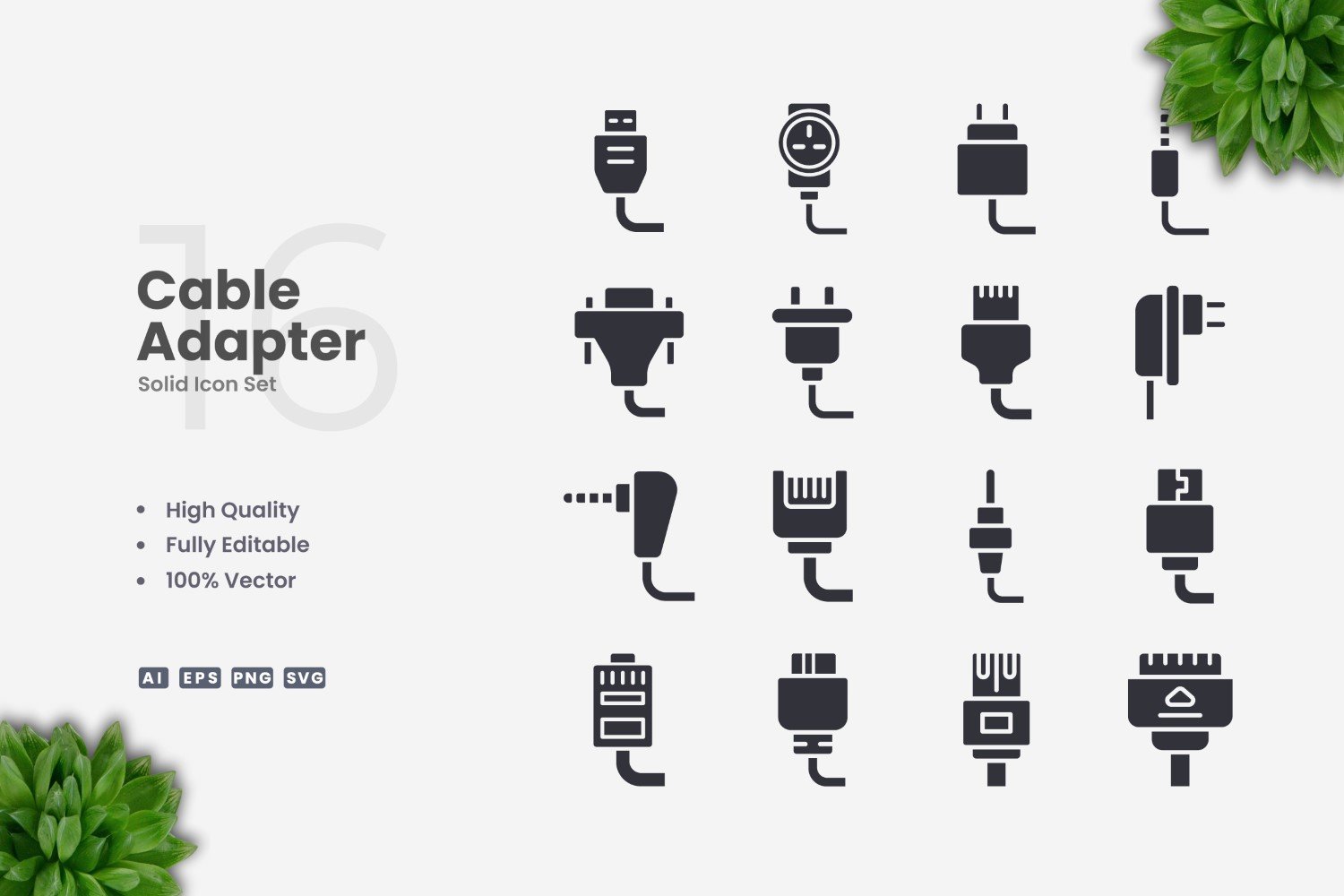 Set of 16 Cable Adapter Solid Icons | Simple and clean design, perfect for websites, mobile apps, books, social media, infographics, flyer, print, banners, posters and many more. To resize or change color you can easily edit on vector software like Adobe Illustrator and CorelDRAW.
