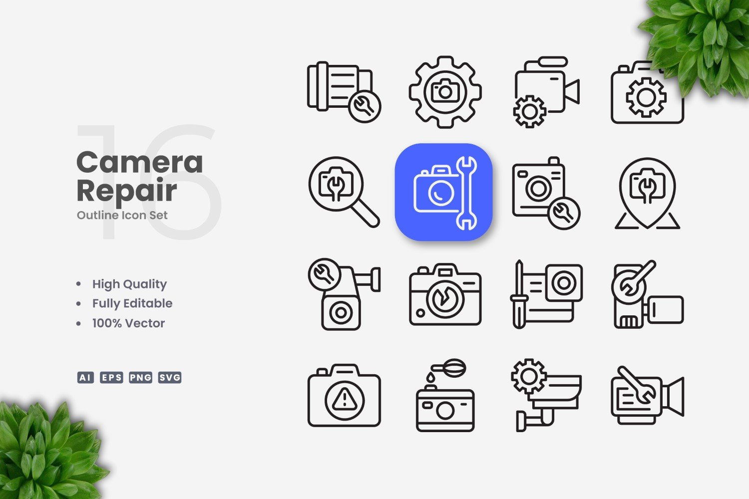 Set of 16 Camera Repair outline icons | Simple and clean design, perfect for websites, mobile apps, books, social media, infographics, flyer, print, banners, posters and many more. To resize, change color, or edit stroke weight, you can easily edit on vector software like Adobe Illustrator and CorelDRAW.