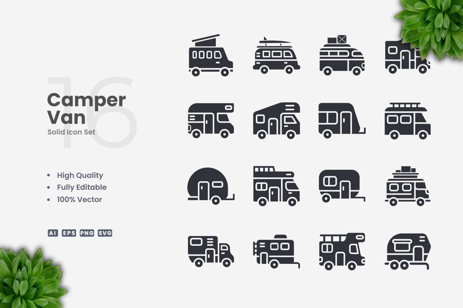 Set of 16 Camper Van Solid Icons | Simple and clean design, perfect for websites, mobile apps, books, social media, infographics, flyer, print, banners, posters and many more. To resize or change color you can easily edit on vector software like Adobe Illustrator and CorelDRAW.