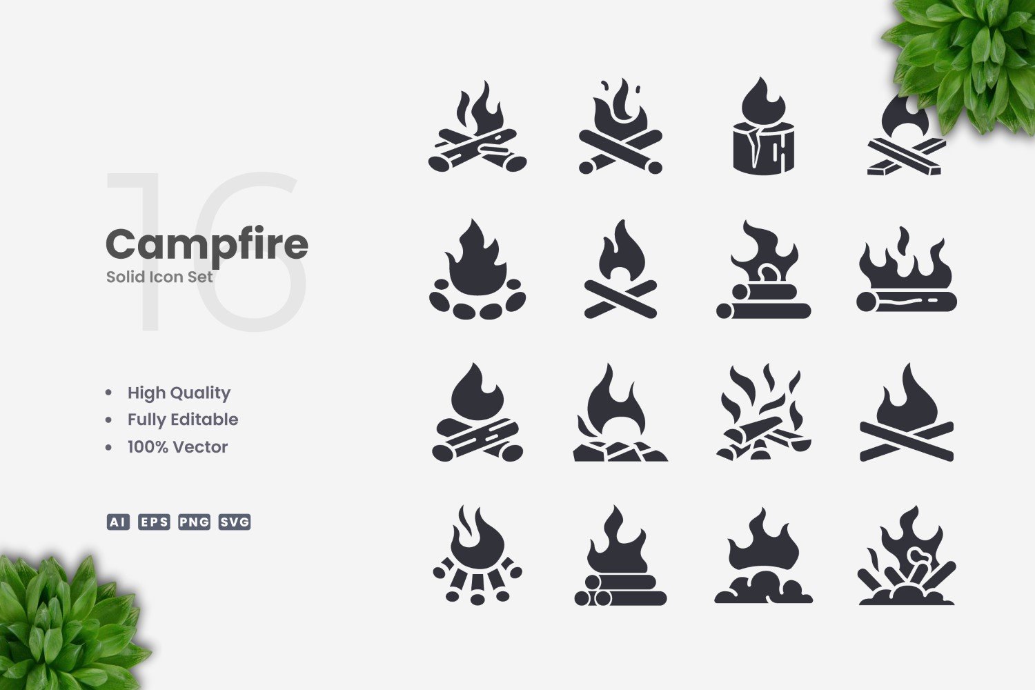 Set of 16 Campfire Solid Icons | Simple and clean design, perfect for websites, mobile apps, books, social media, infographics, flyer, print, banners, posters and many more. To resize or change color you can easily edit on vector software like Adobe Illustrator and CorelDRAW.