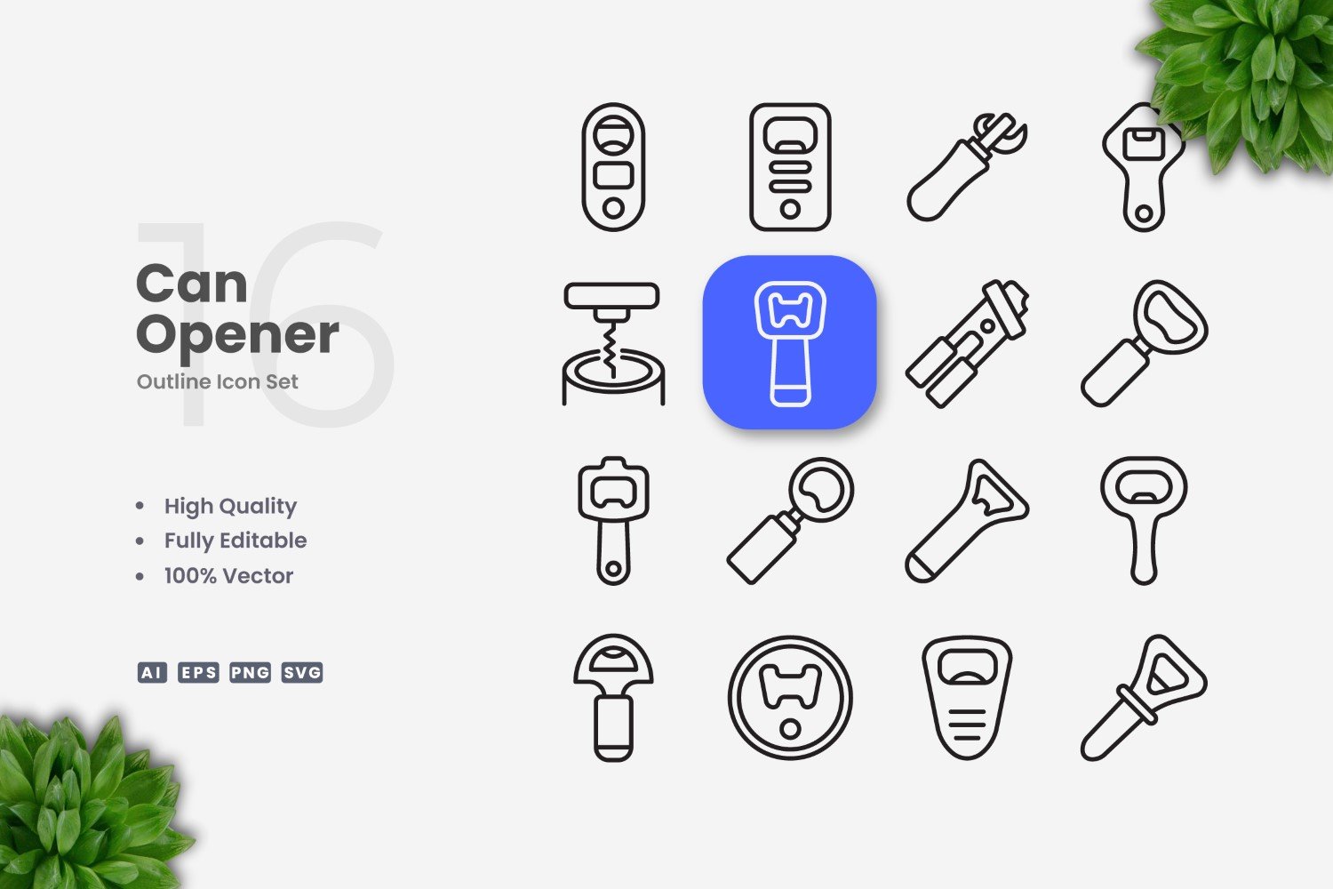 Set of 16 Can Opener outline icons | Simple and clean design, perfect for websites, mobile apps, books, social media, infographics, flyer, print, banners, posters and many more. To resize, change color, or edit stroke weight, you can easily edit on vector software like Adobe Illustrator and CorelDRAW.