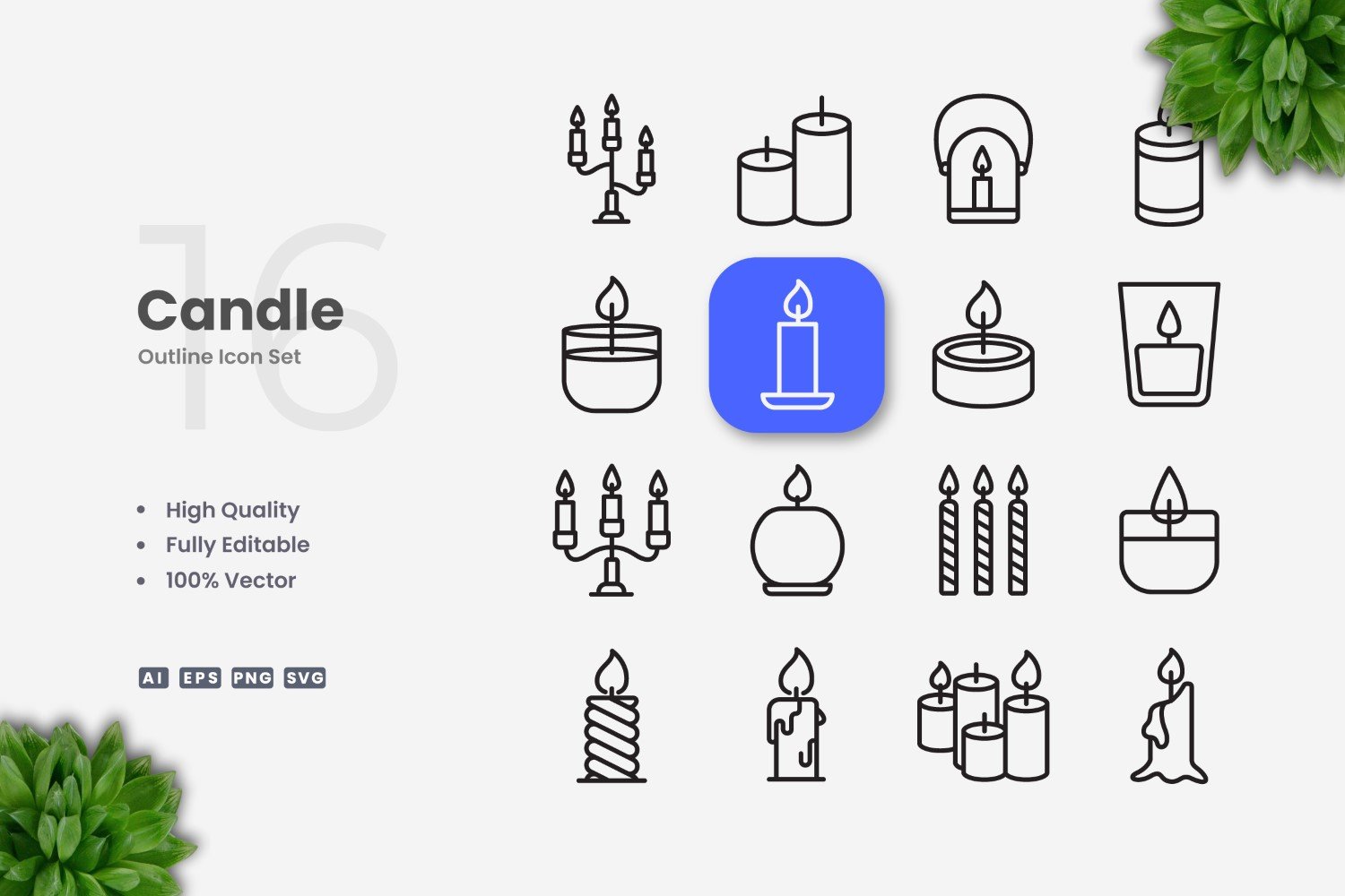 Set of 16 Candle outline icons | Simple and clean design, perfect for websites, mobile apps, books, social media, infographics, flyer, print, banners, posters and many more. To resize, change color, or edit stroke weight, you can easily edit on vector software like Adobe Illustrator and CorelDRAW.