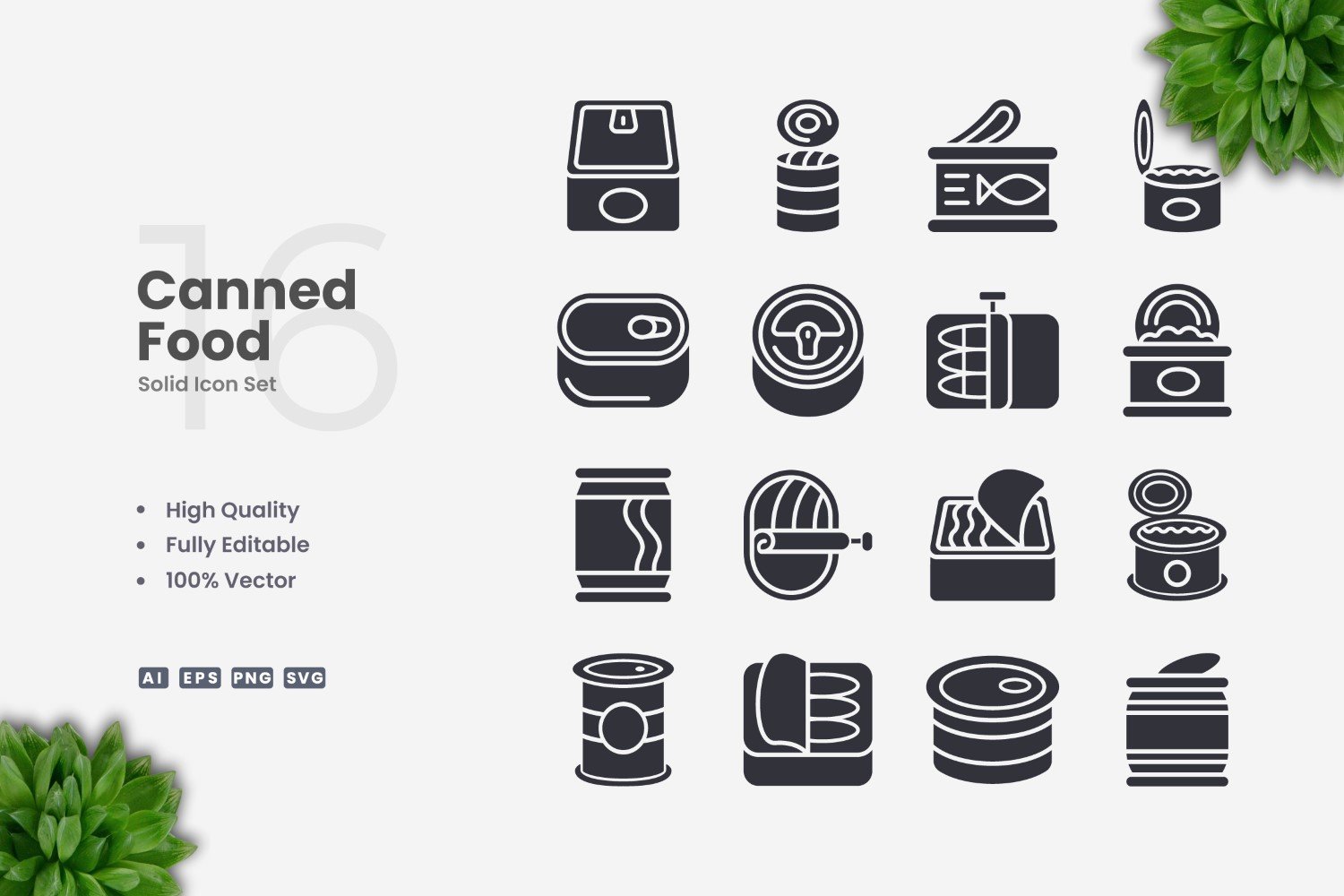 Set of 16 Canned Food Solid Icons | Simple and clean design, perfect for websites, mobile apps, books, social media, infographics, flyer, print, banners, posters and many more. To resize or change color you can easily edit on vector software like Adobe Illustrator and CorelDRAW.