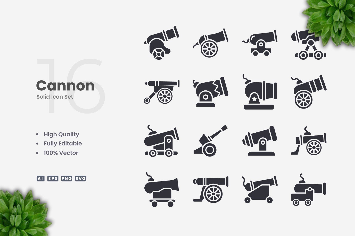 Set of 16 Cannon Solid Icons | Simple and clean design, perfect for websites, mobile apps, books, social media, infographics, flyer, print, banners, posters and many more. To resize or change color you can easily edit on vector software like Adobe Illustrator and CorelDRAW.