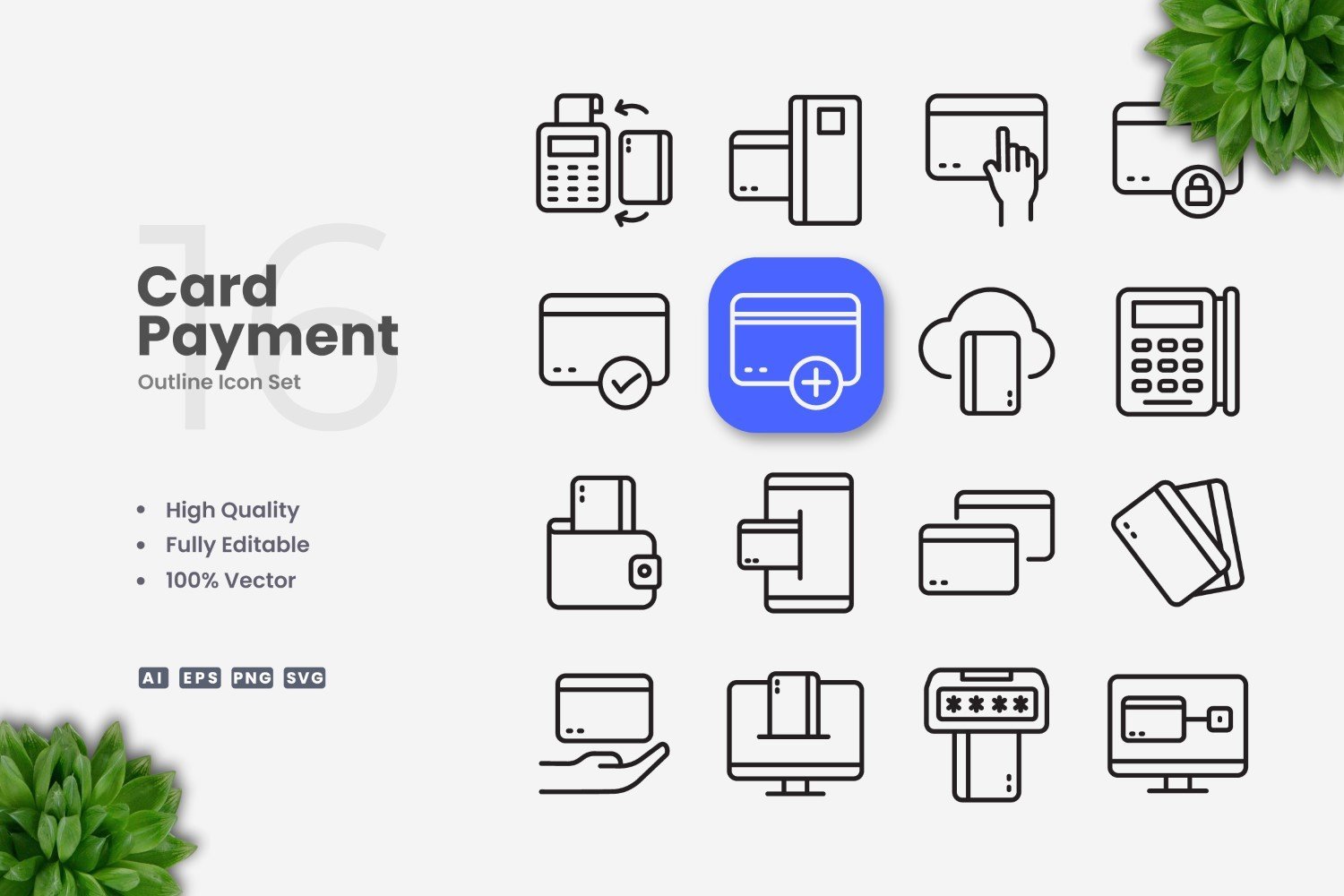 Set of 16 Card Payment outline icons | Simple and clean design, perfect for websites, mobile apps, books, social media, infographics, flyer, print, banners, posters and many more. To resize, change color, or edit stroke weight, you can easily edit on vector software like Adobe Illustrator and CorelDRAW.
