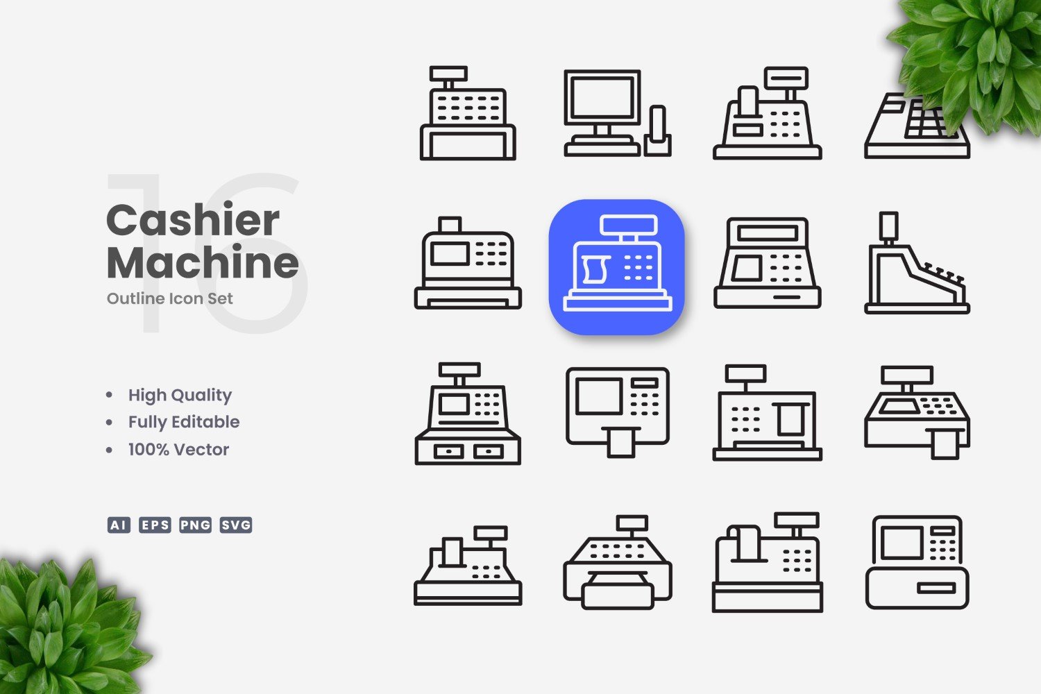 Set of 16 Cashier Machine outline icons | Simple and clean design, perfect for websites, mobile apps, books, social media, infographics, flyer, print, banners, posters and many more. To resize, change color, or edit stroke weight, you can easily edit on vector software like Adobe Illustrator and CorelDRAW.