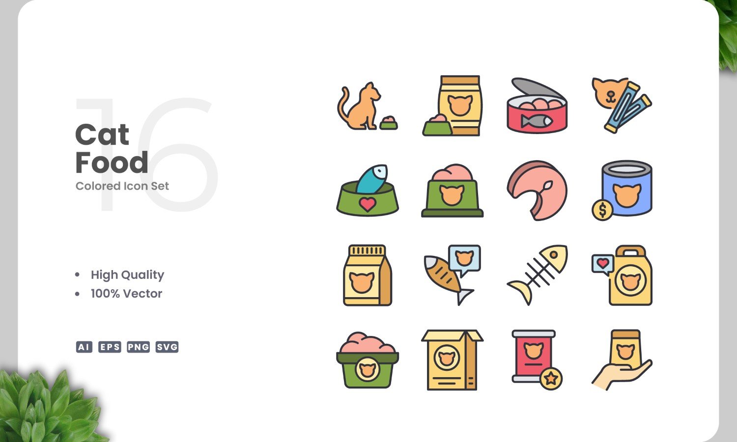 Set of 16 Cat Food color icons | Simple and clean design, perfect for websites, mobile apps, books, social media, infographics, flyer, print, banners, posters and many more. To resize or change color you can easily edit on vector software like Adobe Illustrator and CorelDRAW.