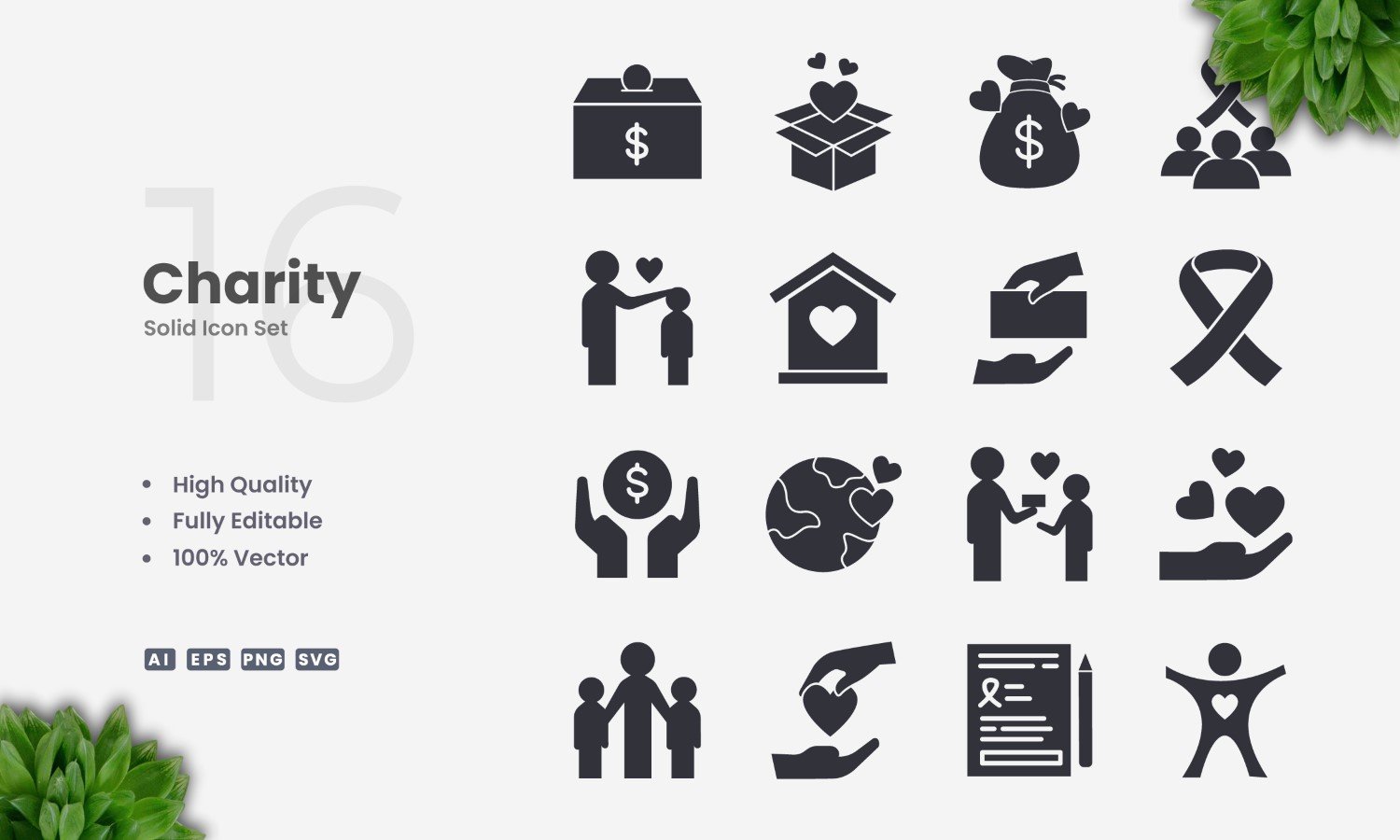 Set of 16 Charity solid icons | Simple and clean design, perfect for websites, mobile apps, books, social media, infographics, flyer, print, banners, posters and many more. To resize or change color you can easily edit on vector software like Adobe Illustrator and CorelDRAW.