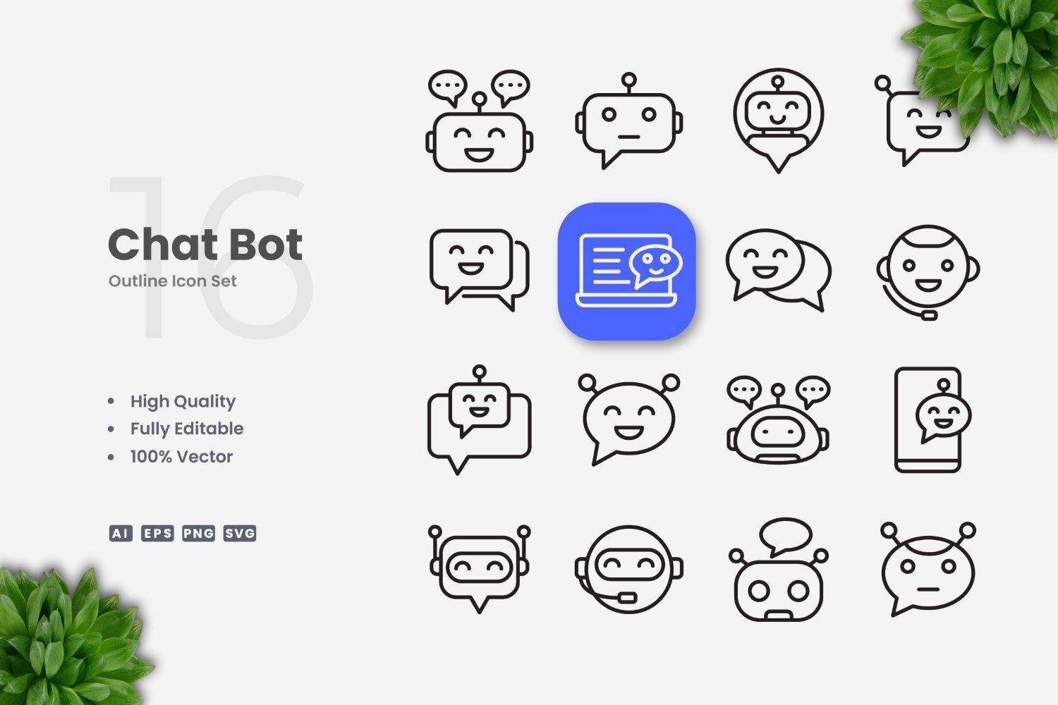 Set of 16 Chat Bot outline icons | Simple and clean design, perfect for websites, mobile apps, books, social media, infographics, flyer, print, banners, posters and many more. To resize, change color, or edit stroke weight, you can easily edit on vector software like Adobe Illustrator and CorelDRAW.