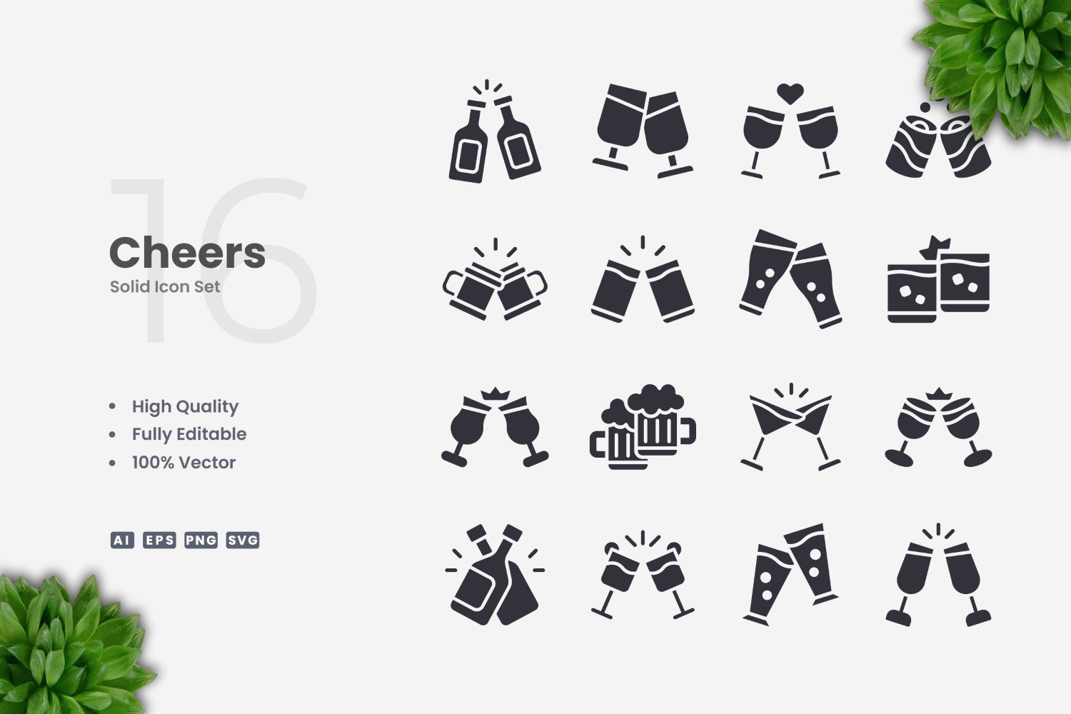 Set of 16 Cheers Solid Icons | Simple and clean design, perfect for websites, mobile apps, books, social media, infographics, flyer, print, banners, posters and many more. To resize or change color you can easily edit on vector software like Adobe Illustrator and CorelDRAW.