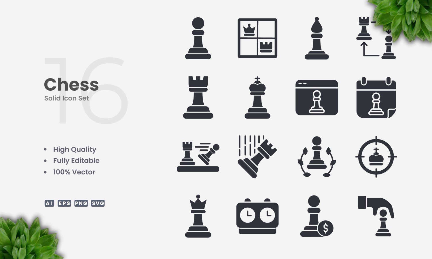 Set of 16 Chess solid icons | Simple and clean design, perfect for websites, mobile apps, books, social media, infographics, flyer, print, banners, posters and many more. To resize or change color you can easily edit on vector software like Adobe Illustrator and CorelDRAW.
