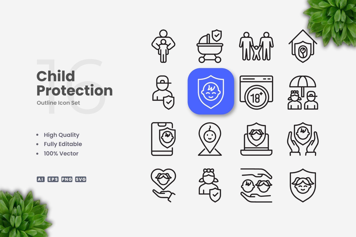Set of 16 Child Protection outline icons | Simple and clean design, perfect for websites, mobile apps, books, social media, infographics, flyer, print, banners, posters and many more. To resize, change color, or edit stroke weight, you can easily edit on vector software like Adobe Illustrator and CorelDRAW.
