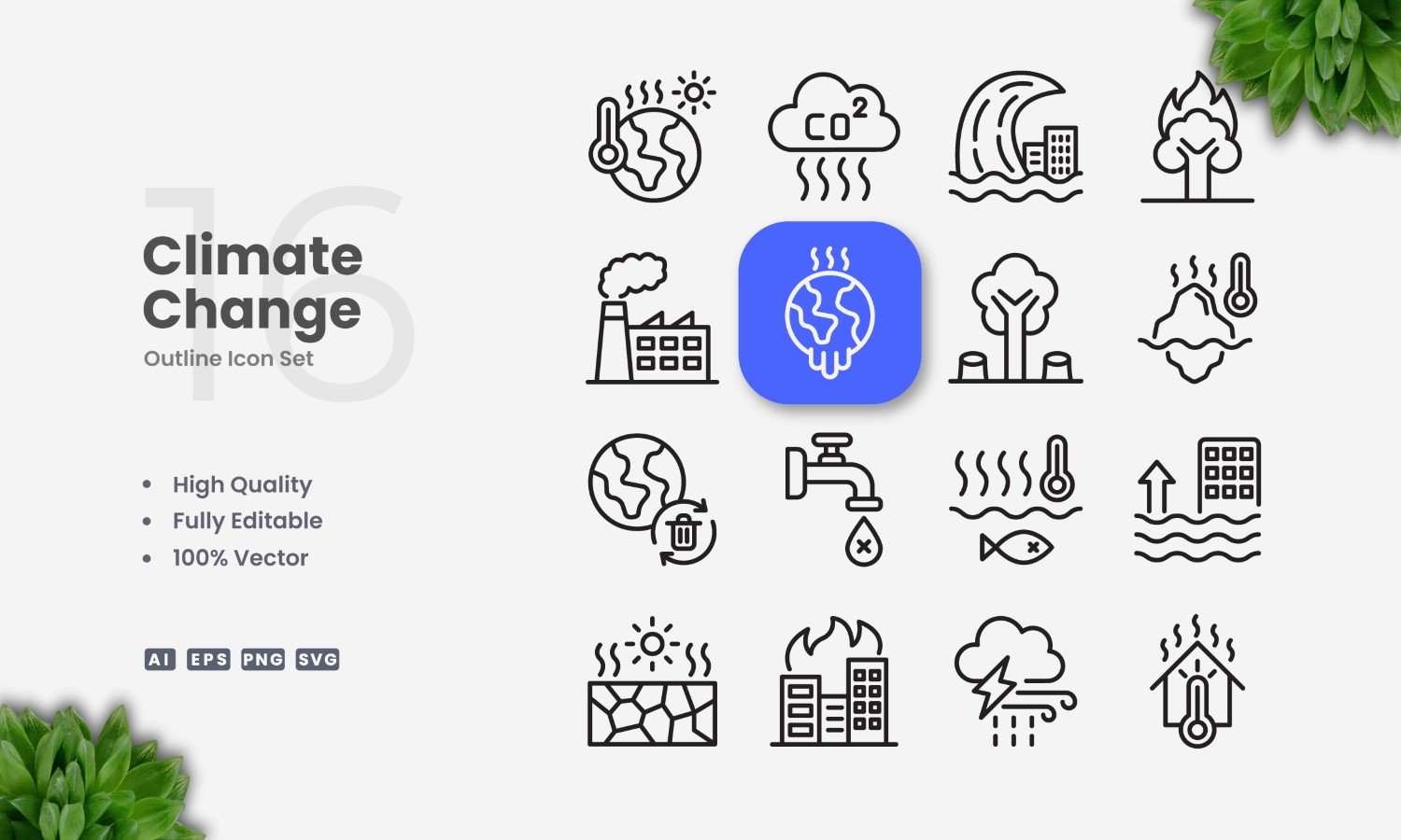 Set of 16 Climate Change outline icons | Simple and clean design, perfect for websites, mobile apps, books, social media, infographics, flyer, print, banners, posters and many more. To resize, change color, or edit stroke weight, you can easily edit on vector software like Adobe Illustrator and CorelDRAW.