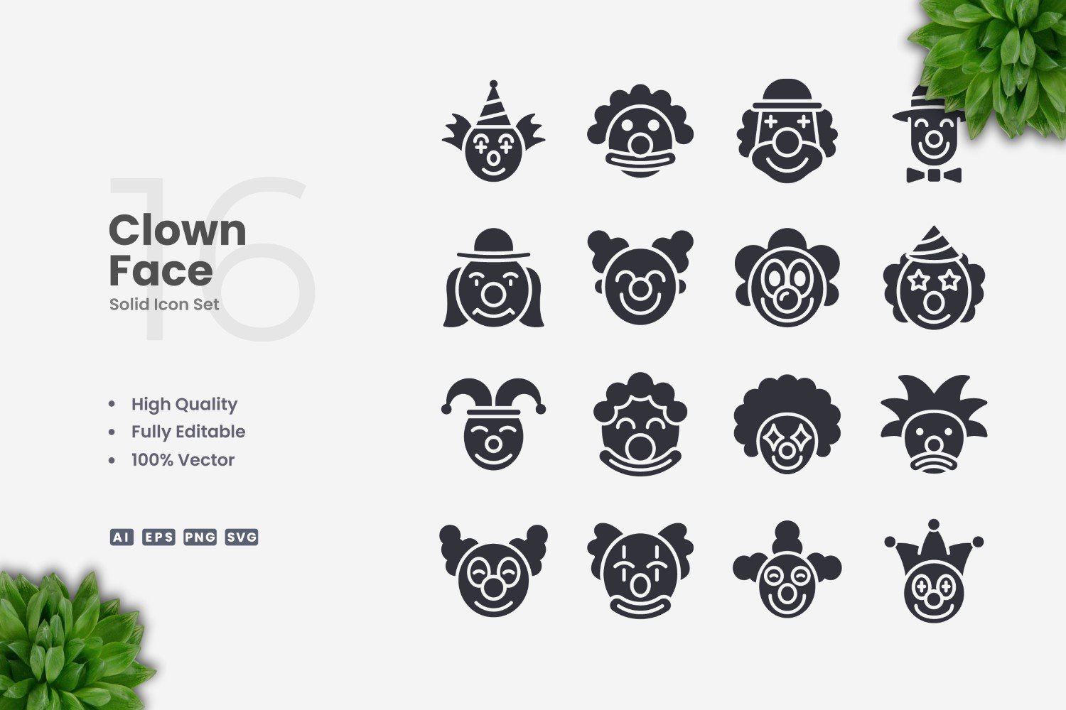 Set of 16 Clown Face Solid Icons | Simple and clean design, perfect for websites, mobile apps, books, social media, infographics, flyer, print, banners, posters and many more. To resize or change color you can easily edit on vector software like Adobe Illustrator and CorelDRAW.