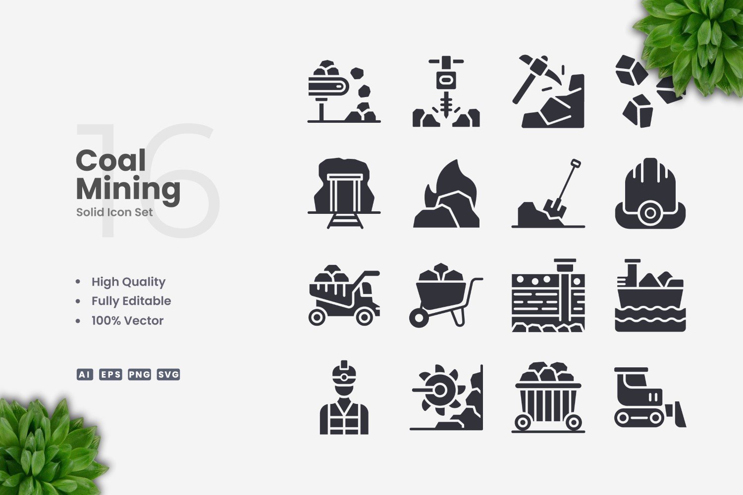 Set of 16 Coal Mining Solid Icons | Simple and clean design, perfect for websites, mobile apps, books, social media, infographics, flyer, print, banners, posters and many more. To resize or change color you can easily edit on vector software like Adobe Illustrator and CorelDRAW.