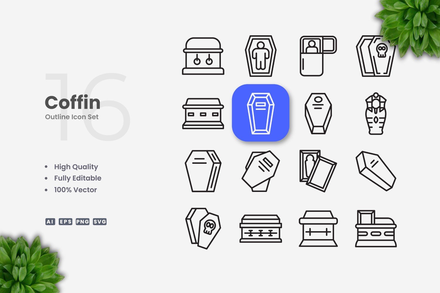 Set of 16 Coffin outline icons | Simple and clean design, perfect for websites, mobile apps, books, social media, infographics, flyer, print, banners, posters and many more. To resize, change color, or edit stroke weight, you can easily edit on vector software like Adobe Illustrator and CorelDRAW.
