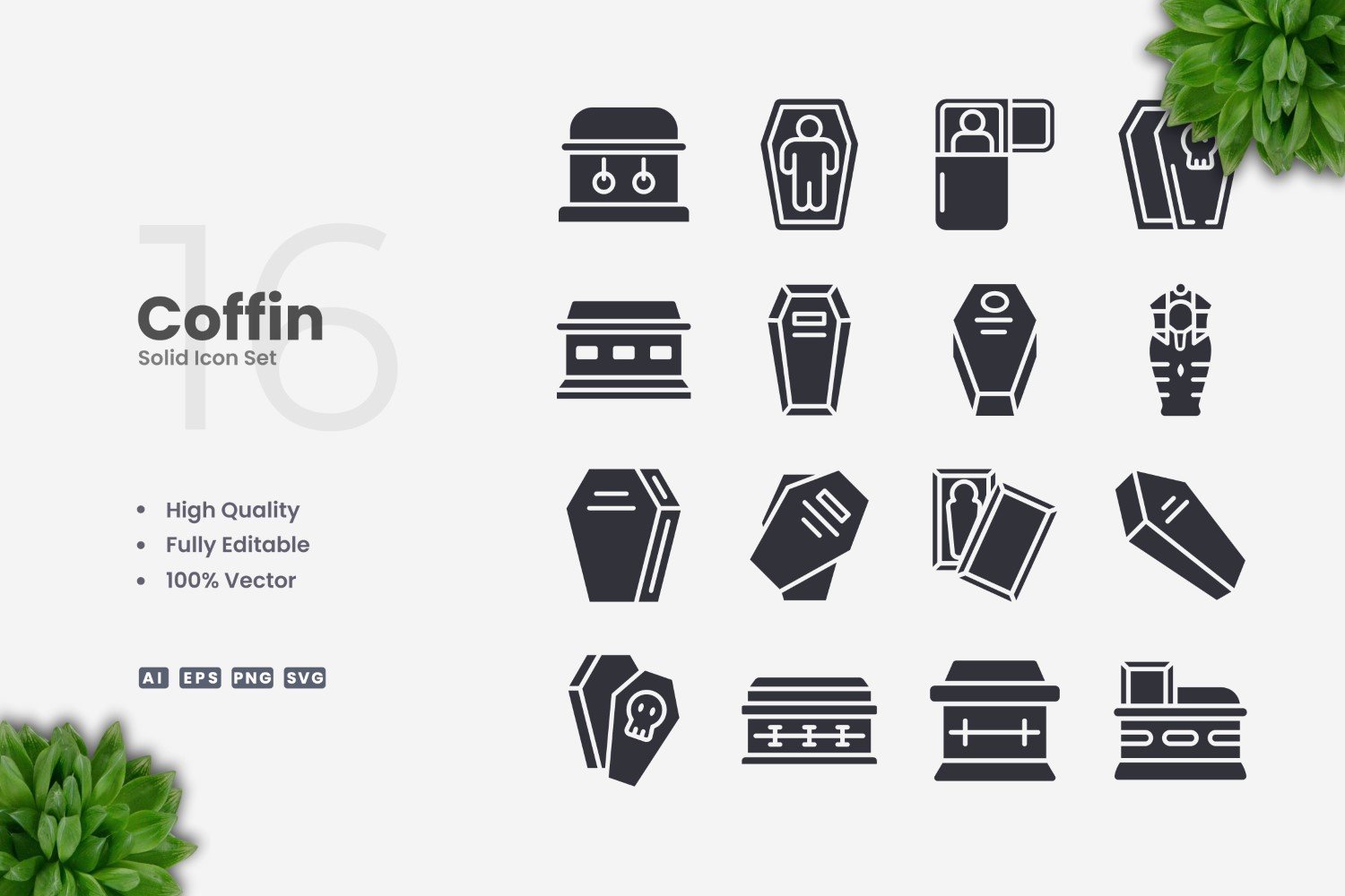 Set of 16 Coffin Solid Icons | Simple and clean design, perfect for websites, mobile apps, books, social media, infographics, flyer, print, banners, posters and many more. To resize or change color you can easily edit on vector software like Adobe Illustrator and CorelDRAW.