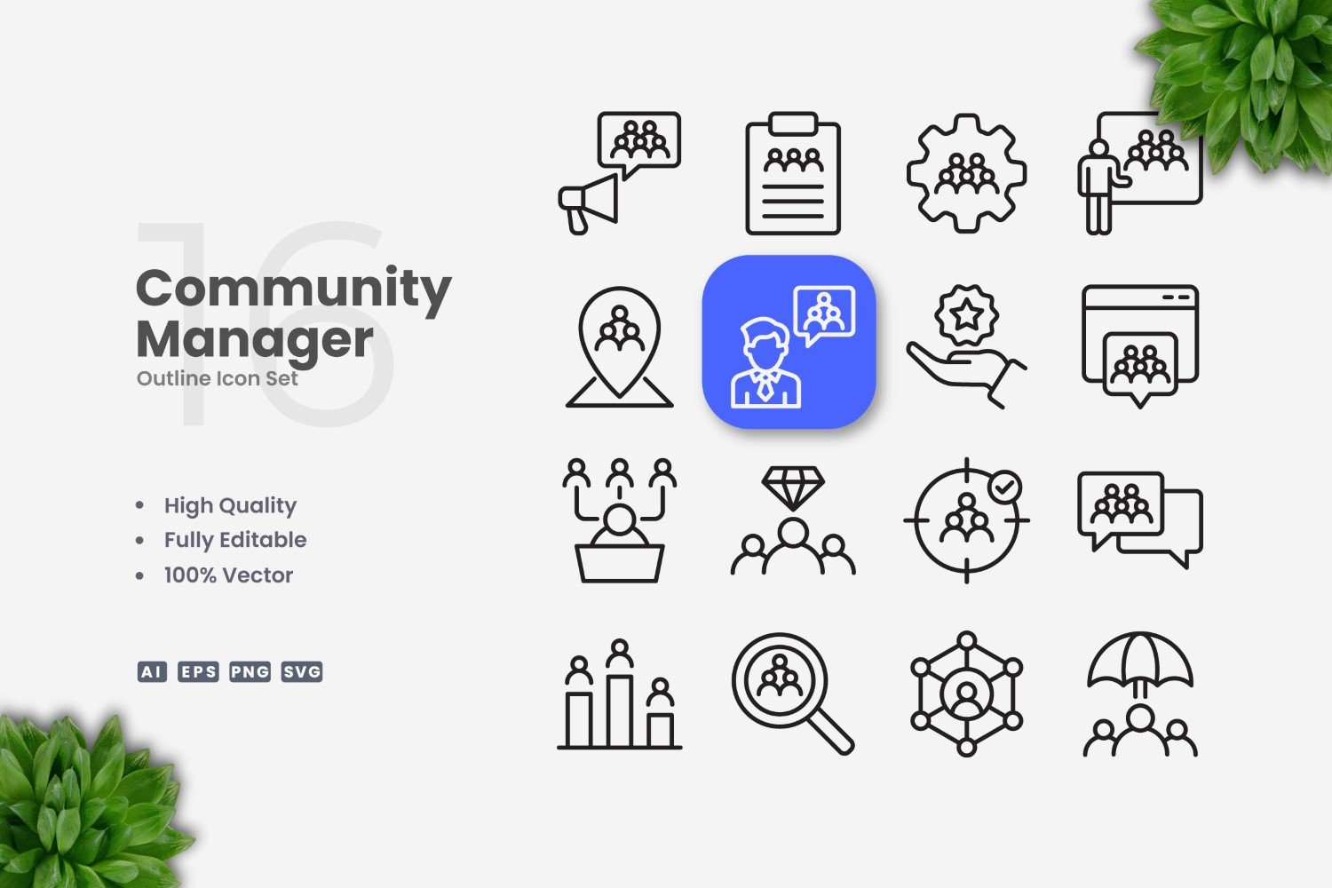 Set of 16 Community Manager outline icons | Simple and clean design, perfect for websites, mobile apps, books, social media, infographics, flyer, print, banners, posters and many more. To resize, change color, or edit stroke weight, you can easily edit on vector software like Adobe Illustrator and CorelDRAW.
