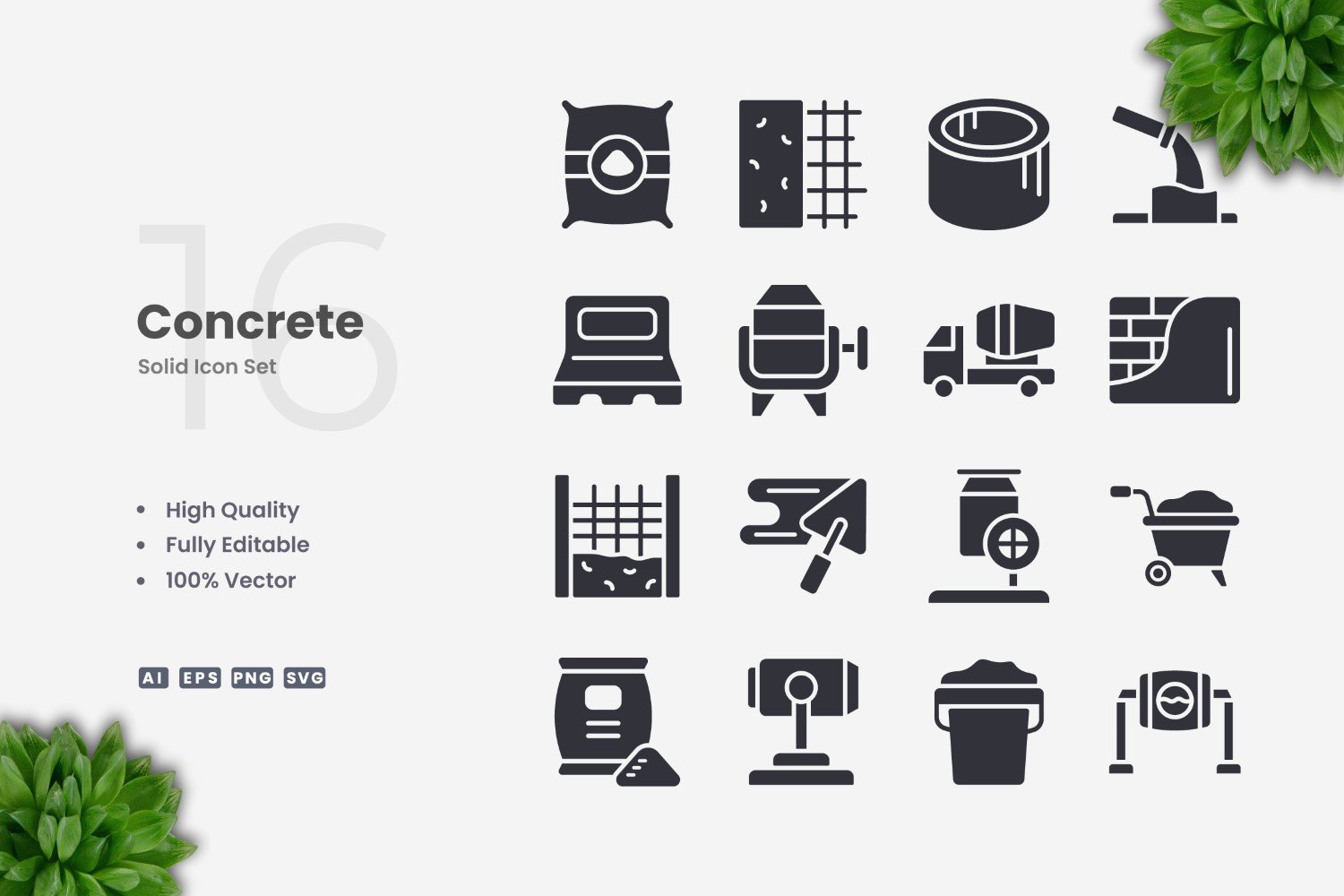 Set of 16 Concrete Solid Icons | Simple and clean design, perfect for websites, mobile apps, books, social media, infographics, flyer, print, banners, posters and many more. To resize or change color you can easily edit on vector software like Adobe Illustrator and CorelDRAW.