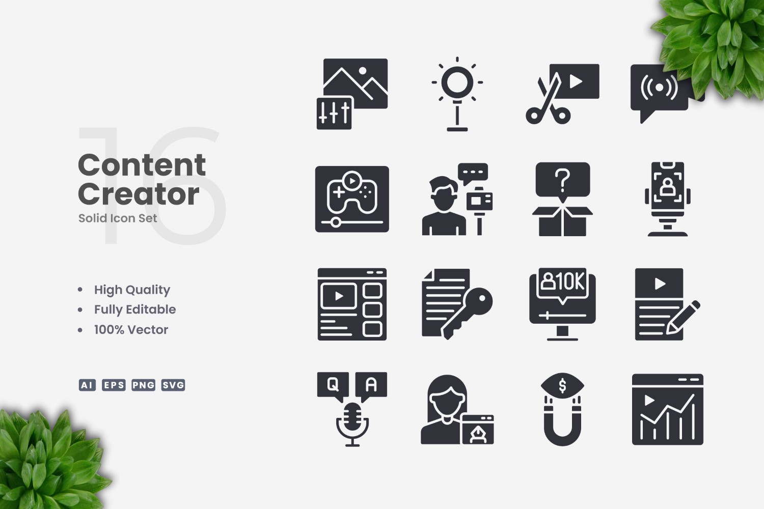 Set of 16 Content Creator2 Solid Icons | Simple and clean design, perfect for websites, mobile apps, books, social media, infographics, flyer, print, banners, posters and many more. To resize or change color you can easily edit on vector software like Adobe Illustrator and CorelDRAW.
