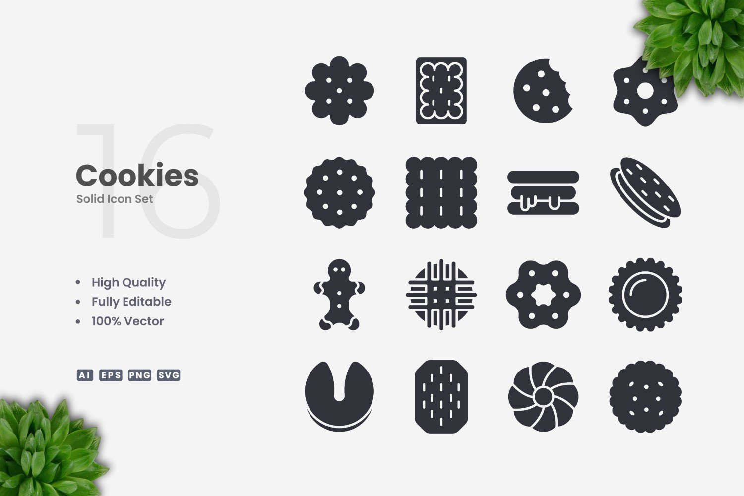 Set of 16 Cookies Solid Icons | Simple and clean design, perfect for websites, mobile apps, books, social media, infographics, flyer, print, banners, posters and many more. To resize or change color you can easily edit on vector software like Adobe Illustrator and CorelDRAW.